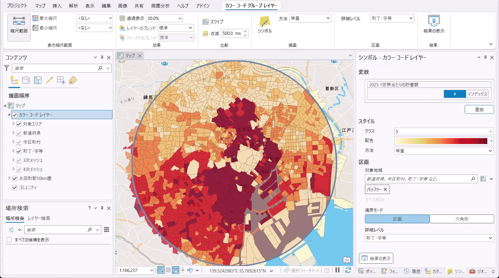 従来、メッシュ区画のデータは人口総数などの一部指標のみでしたが、推計年収別世帯数、推計貯蓄別世帯数、推計消費額、推計将来人口を含む全指標で利用できるようになりました。この更新により、たとえばカラーコード レイヤーの作成ツールを使って、町丁・字等やメッシュをすぐに切り替えてマッピングできるようになりました。