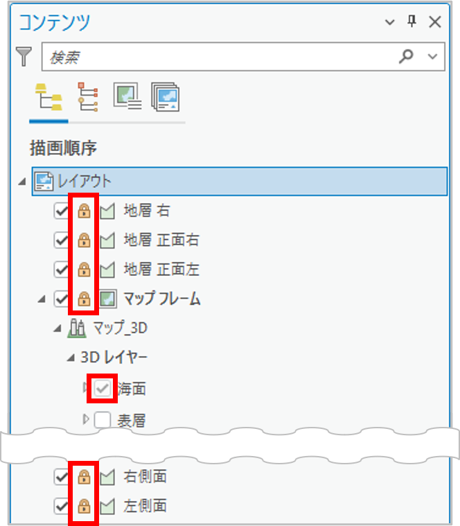 - [海面] レイヤーが非表示になっている場合は、[コンテンツ] ウィンドウでチェックボックスをクリックして表示します。また、誤操作によってレイアウトが崩れないように鍵マークをクリックし、作成済みのすべてのコンテンツをロックします。