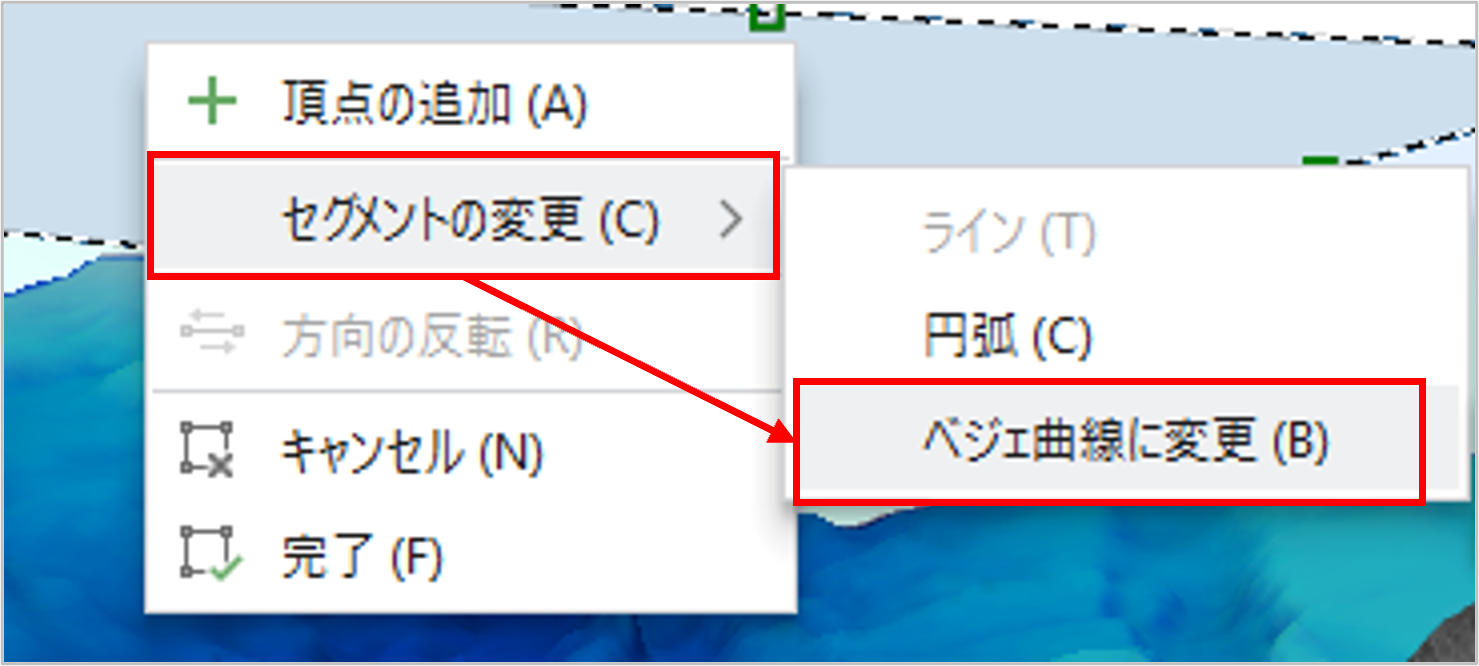 - 任意の頂点間のポリゴンの枠線をクリックし、[セグメントの変更] → [ベジェ曲線に変更] をクリックします。