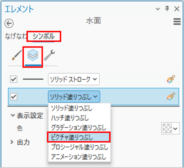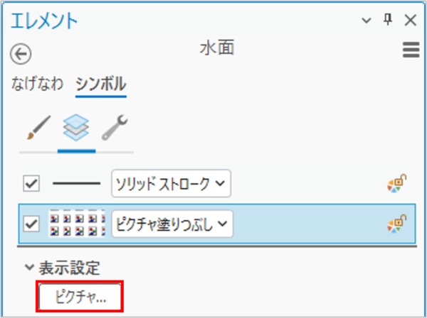 - [水面] ポリゴンの [エレメント] ウィンドウを開き、 [シンボル] をクリックします。