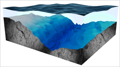 上の画像は日本人がたどり着いた最も深い場所である小笠原海溝の最深部 (暫定 9,801m) の様子を ArcGIS Pro のレイアウトを使用して 3D ジオラマとして可視化したものです。