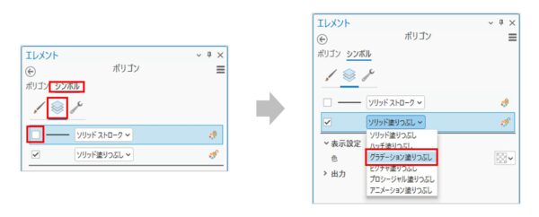 - [コンテンツ] ウィンドウで [ポリゴン] の[プロパティ] から [エレメント] ウィンドウで [シンボル] をクリックします。