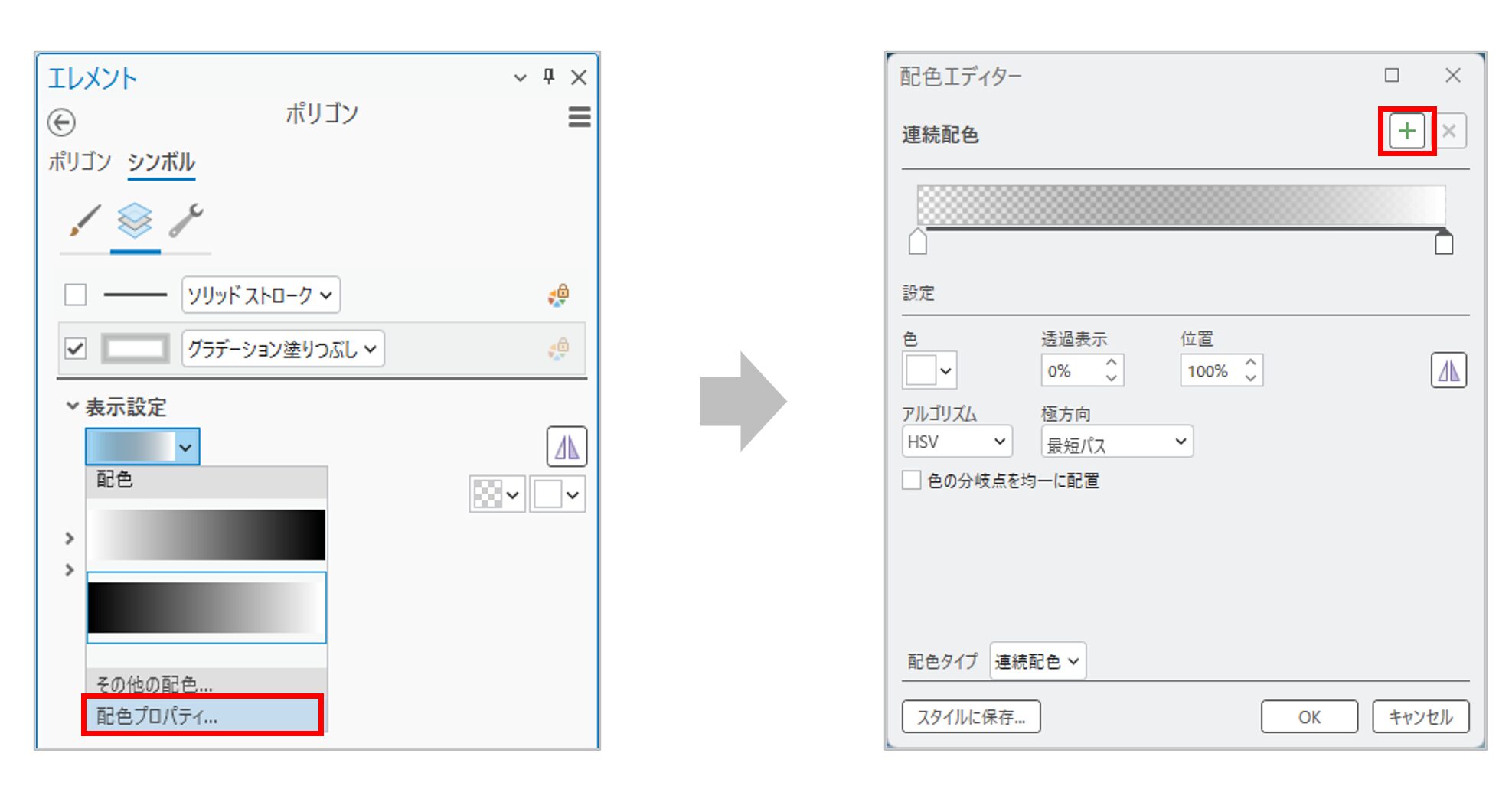 - [表示設定] のドロップダウンを展開して [配色プロパティ] をクリックし、[配色エディター] を開きます。