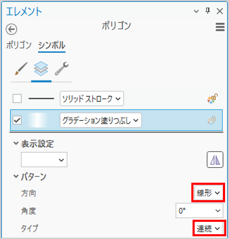 - パターンで [方向] を「線形」に、[タイプ] を「連続」に変更します。