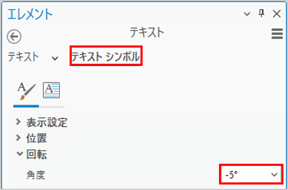 - 画面右側の [エレメント] ウィンドウで [テキスト シンボル] をクリックし、[回転] を展開します。
