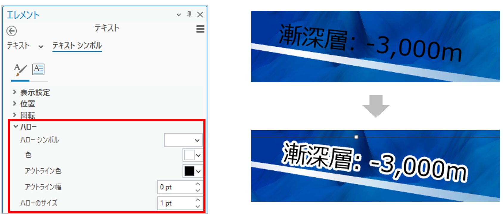 文字が背景と重なって読みにくい場合は、[テキスト シンボル] タブの [ハロー] を設定すると見やすい表現が可能です。