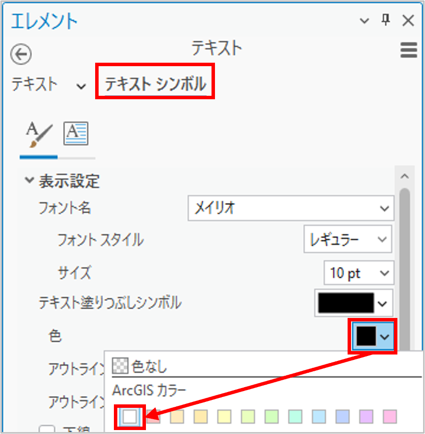 - 背景と同化して文字が見えにくいため、[エレメント] ウィンドウの [テキスト シンボル] タブで [テキスト塗りつぶしシンボル] の [色] を「白 (1 番左の列の最上部)」に設定します。