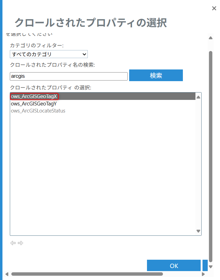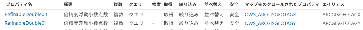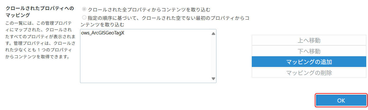 - 管理プロパティ一覧で、[マップ先のクロールされたプロパティ] にそれぞれ「OWS_ArcGISGEOTAGX」、「OWS_ArcGISGEOTAGY」と表示されていれば設定は完了です。