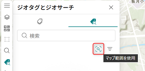 座標情報でジオタグを付与した場合、ジオサーチでは [マップ範囲を使用] をクリックして、現在の表示範囲内にあるジオタグ付けされたコンテンツを検索できます。