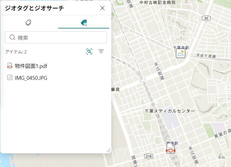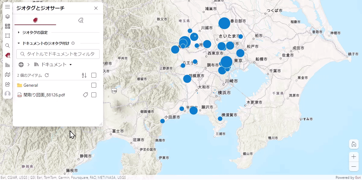 ArcGIS for SharePoint の「ジオタグ」機能は、SharePoint 上のコンテンツに位置情報を付与し、ArcGIS for SharePoint のマップと組み合わせて利用できる機能です。ジオタグを付与されたコンテンツは、「ジオサーチ」機能を使用して、マップ内で検索することが可能になります。 この機能を利用することで、たとえばマップ内の物件ポイントに紐づく図面 PDFを確認したり、PDF に紐づく物件の場所をマップ上で特定したりできます。コンテンツに位置情報を結びつけることで、マップを活用したコンテンツ管理が可能です。