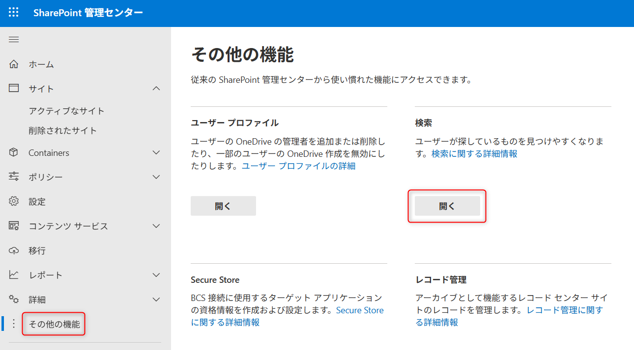 - [その他の機能] → 検索セクションの [開く] をクリックします。