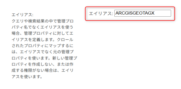 - 経度 (X) の情報と対応するプロパティとして、エイリアスに例として「ARCGISGEOTAGX」と入力します。