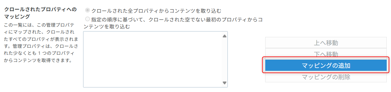- [クロールされたプロパティへのマッピング] で、[マッピングの追加] をクリックします。
