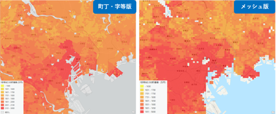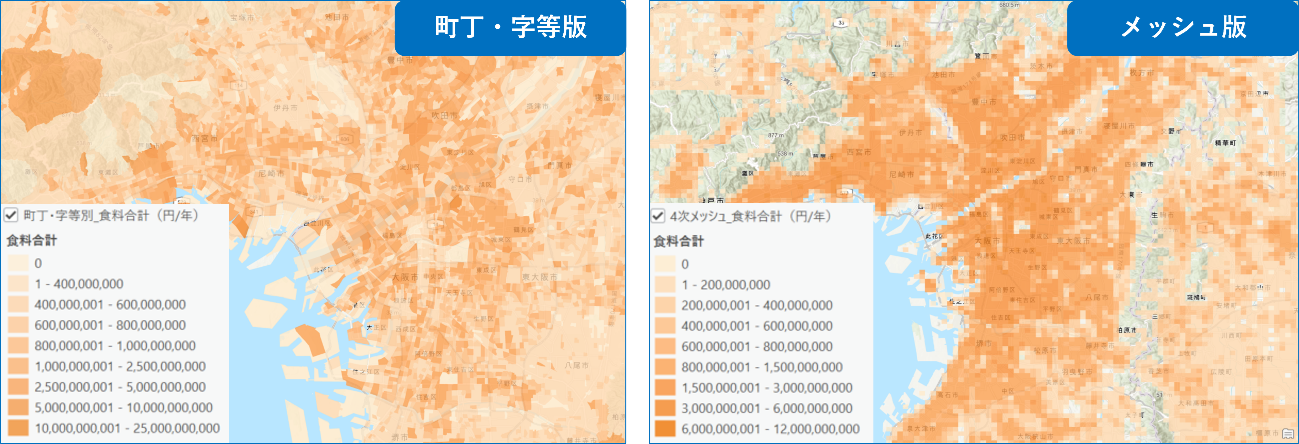 年間あたりの食料品合計消費額 (左:町丁・字等別、右:4 次メッシュ別)