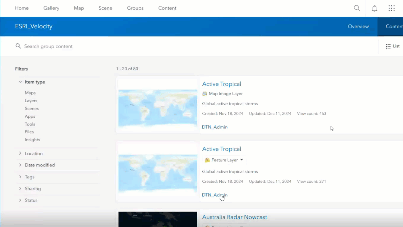 DTN は ArcGIS Enterprise のポータルを所有しているため、DTN の ArcGIS アカウントが必要です。顧客アカウントごとに固有のグループと認証情報が作成され、Velocity ではこれらの認証情報を使用し、割り当てられたグループ内で利用可能な特定のレイヤーを自動的に表示します。これにより、関連するすべての情報へ安全にアクセスすることができます。