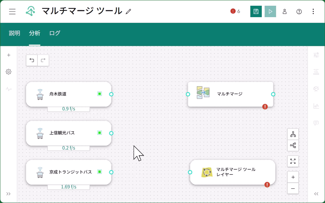 マルチマージ ツールは、複数の入力レイヤーを単一の出力レイヤーに統合することができます。これは既存のマージ ツールの機能を拡張したものです。マルチマージは、同一のジオメトリー タイプ (表形式、ポイント、ライン、ポリゴン) を持ち、対応するフィールド名と型が 1 つ以上あれば、最大 10 の入力レイヤーを統合できます。AVL フィードなどを扱う場合は、類似したフィードを多数所有しているケースが多く、それらを統合することができれば効率的な可視化と解析を実現することができます。従来はこうしたフィードを結合するには、マージ ツール (入力レイヤーは 2 つまでしか扱えない) を複数組み合わせて使用する複雑なワークフローが必要でした。マルチマージ ツールによって、より合理化・簡素化された解析が可能になります。