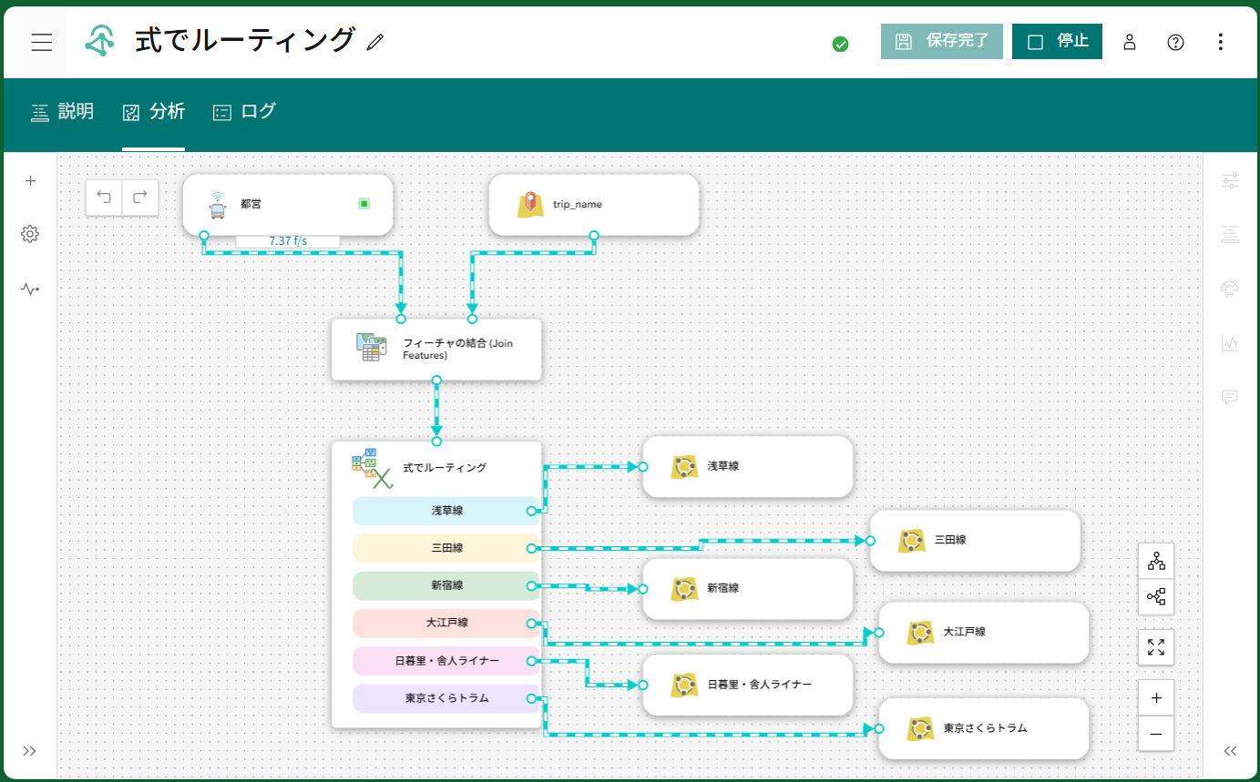 式でルーティング ツールは、受信イベント レコードを ArcGIS Arcade 式で評価し、指定された条件に基づいて各レコードを任意の出力パスへ分岐させることを可能にします。入力フィードに位置情報や状態情報、センサー測定値など複数のレコード タイプが含まれる場合、その下流ではレコード タイプごとに異なる処理を必要とする場合があります。このツールでは条件分岐ロジックを設定し、データを適切な処理へと分岐させることが可能です。これにより、レコード タイプが混合したフィードを、目的に応じたチャネルに重複なく分離する解析ワークフローを、よりシンプルに実現することができます。