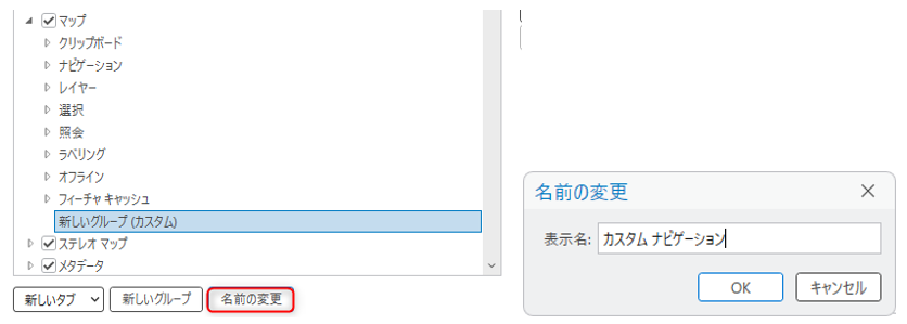 1. [名前の変更] をクリックし、任意の名前に変更します。ここでは「カスタム ナビゲーション」と入力し、[OK] をクリックします。これでグループ名が変更できました。