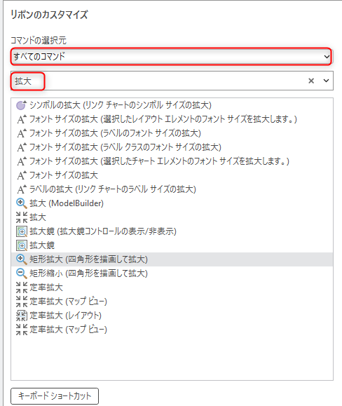 [コマンドの選択元] で [すべてのコマンド] を選択し、テキスト ボックスに「拡大」と入力します。コマンド名に「拡大」が含まれているものだけがリストされます。