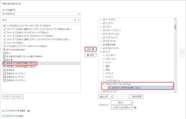 右側の先ほど新しく作成した [カスタム ナビゲーション (カスタム)] グループに [矩形拡大] コマンドが追加されます。