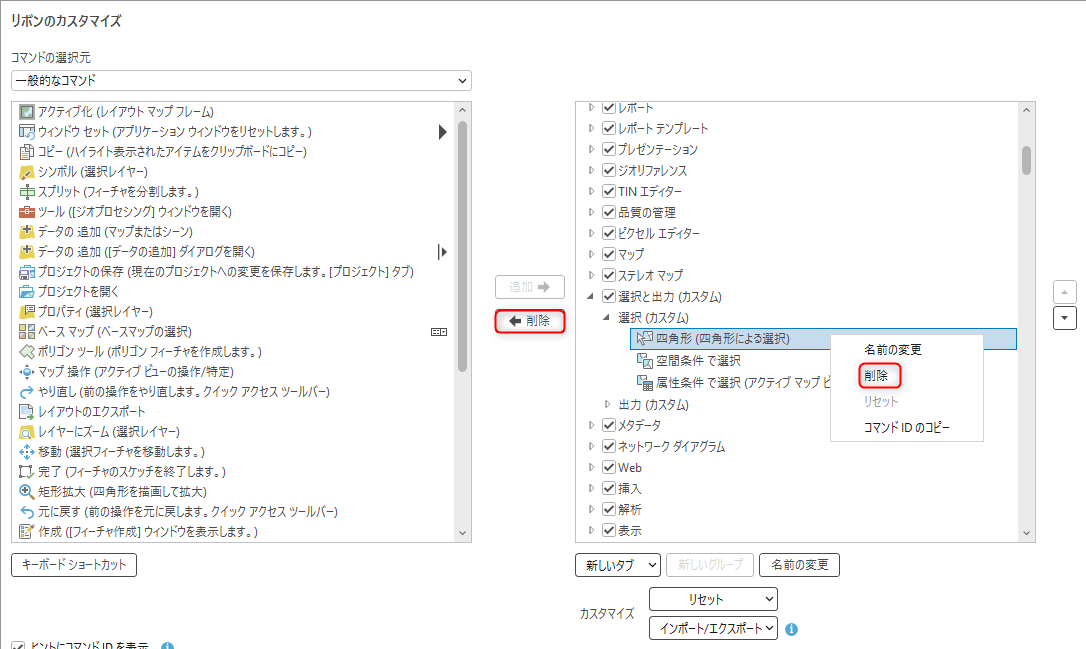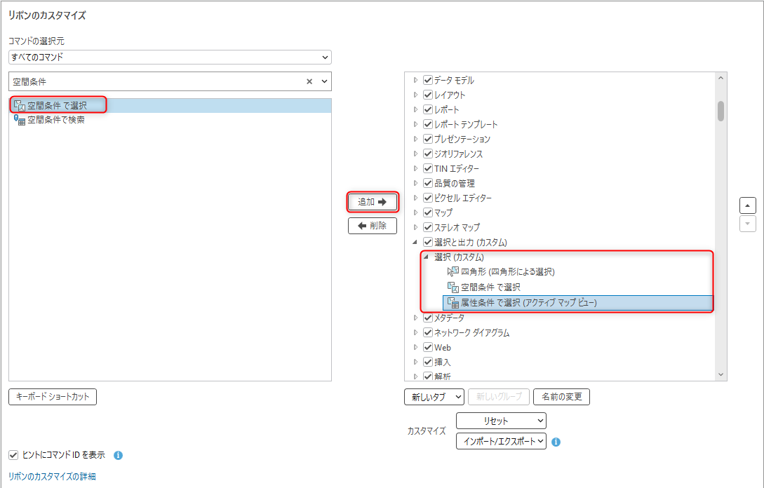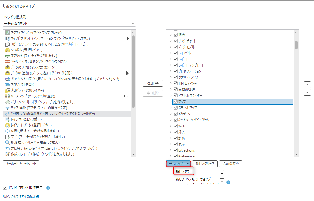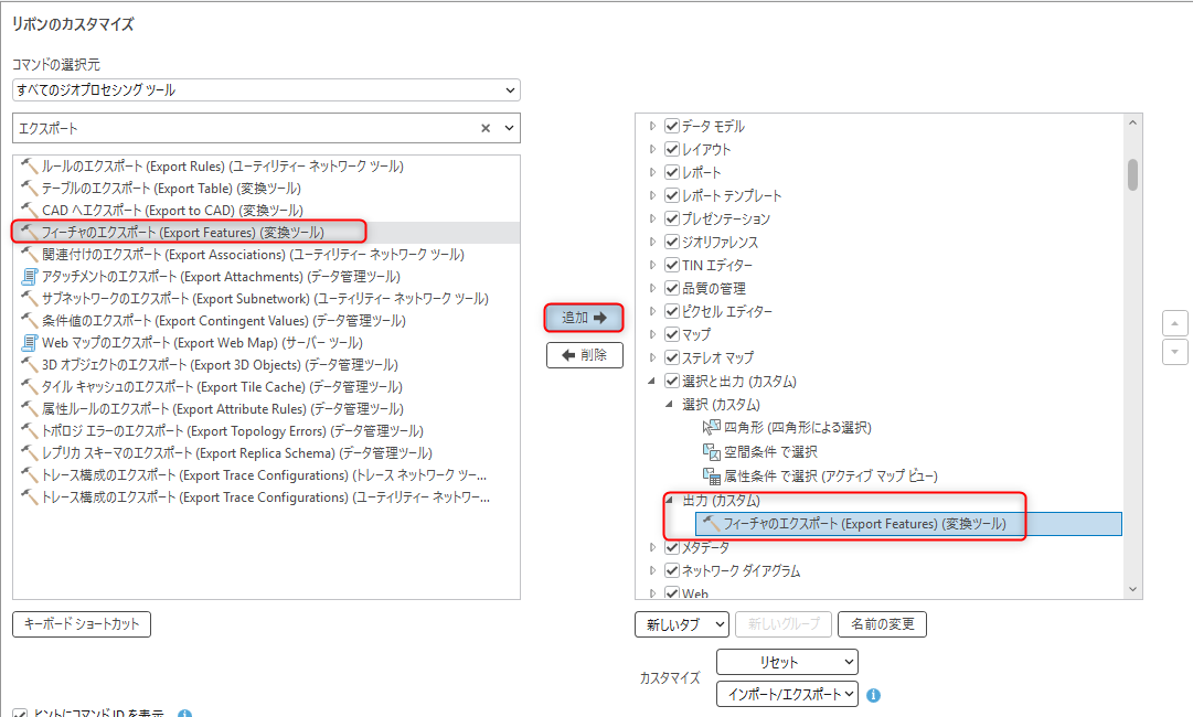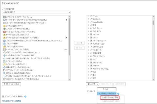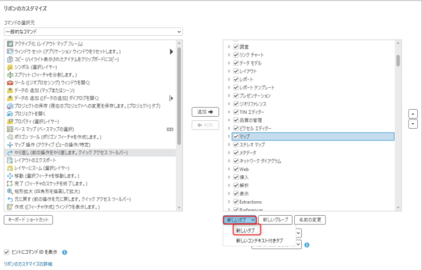 追加できるコマンドが表示されます。ジオプロセシング ツールもコマンドとして追加することが可能です。