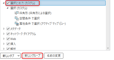 1. 新しく追加したタブである [選択と出力 (カスタム)] を選択し、[新しいグループ] をクリックします。