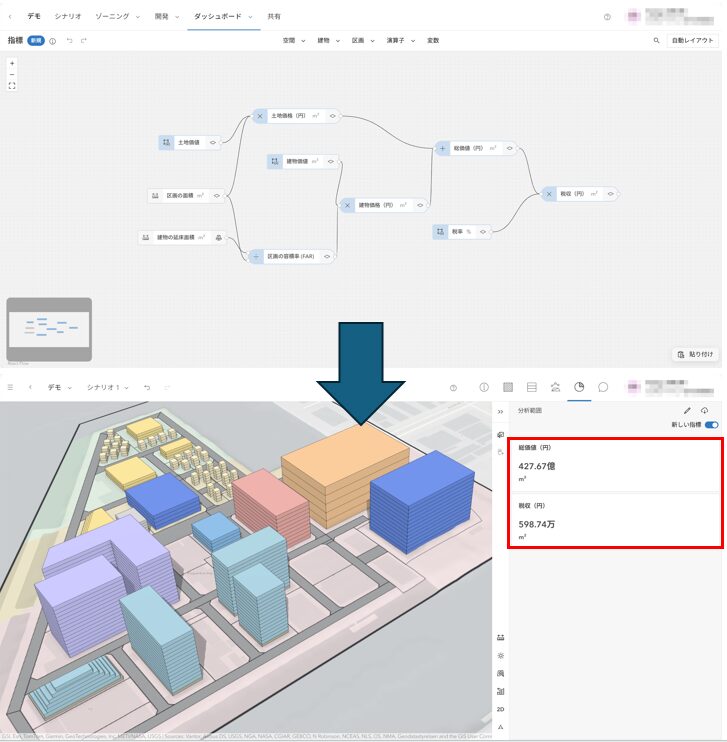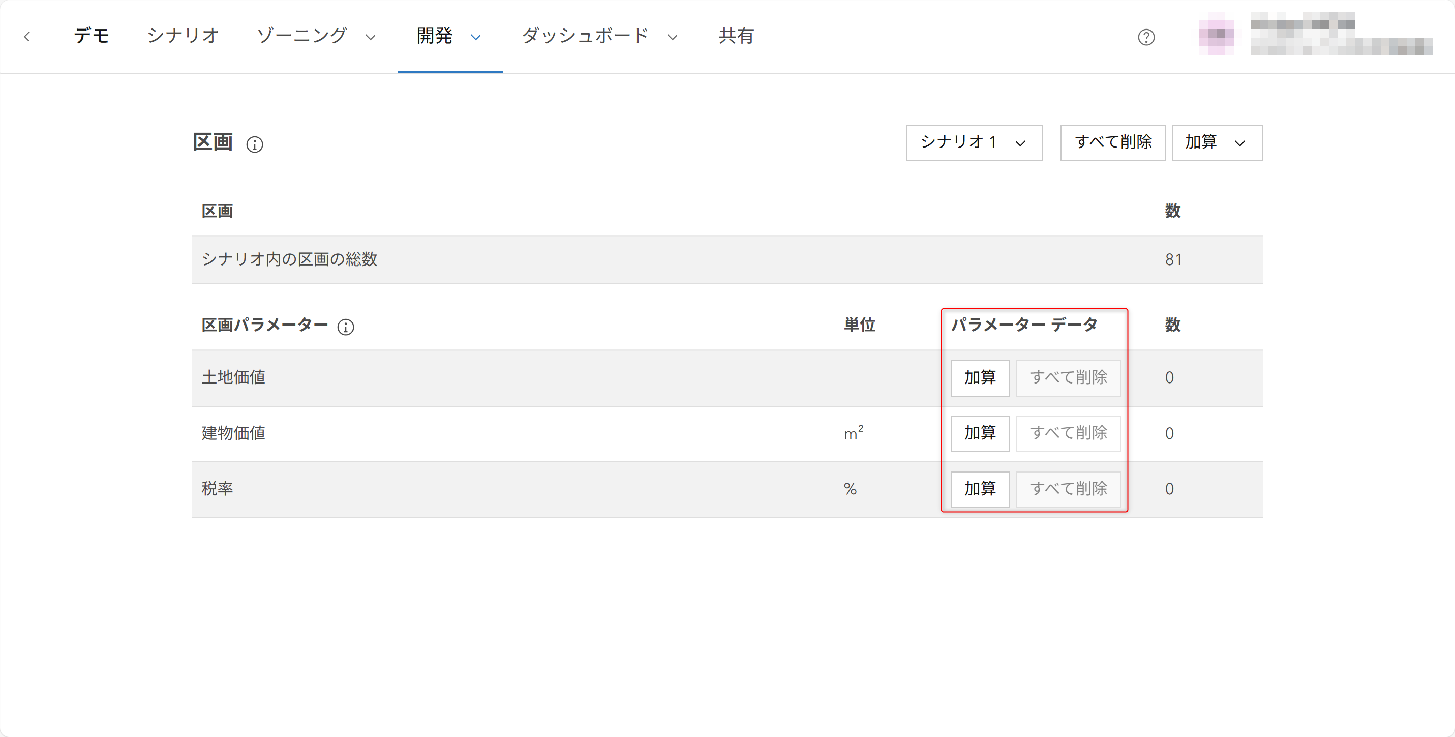指標機能は、都市計画や開発プロジェクトの成果や影響を定量的に評価・可視化するためのツールです。本アップデートにおいて、「区画パラメーター」が追加されました。このパラメーターに土地の価格や人口などの区画固有のデータを設定し、計算に活用できます。