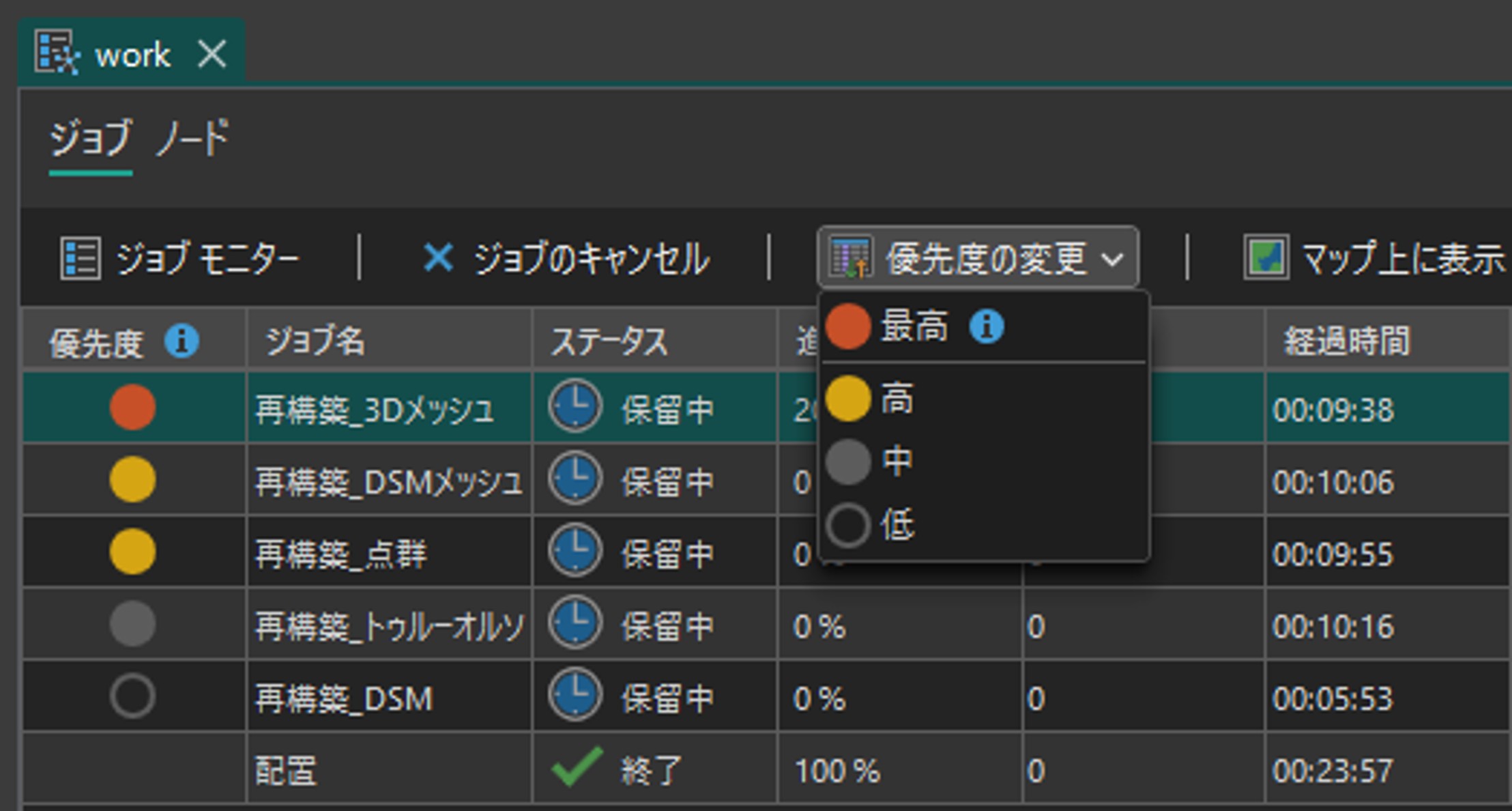 複数ジョブの送信時に、処理の優先順位を設定可能になりました。デフォルトは送信順ですが、「最高・高・中・低」を指定できます。「最高」は 1 つのみ設定可能です。先に処理したいジョブがある場合、優先度を上げることで成果物の生産性を向上できます。