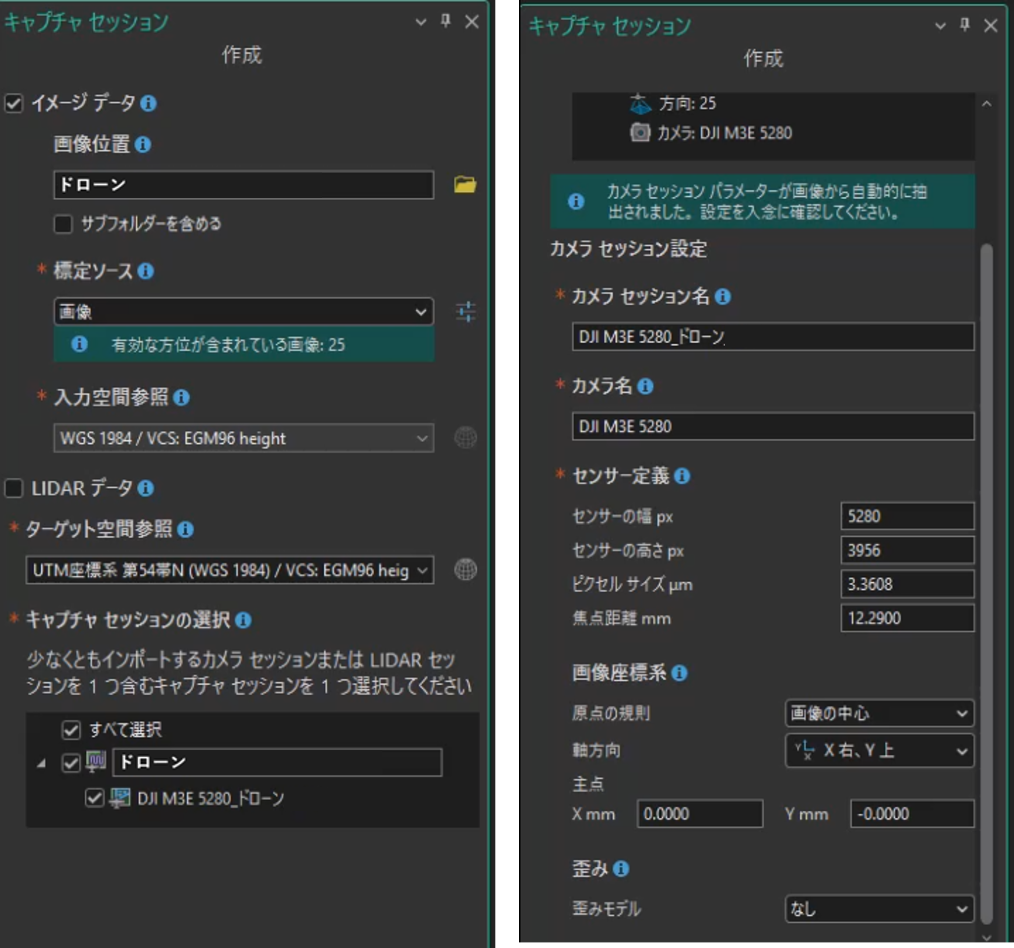 キャプチャ セッションでは、画像を参照することで EXIF 情報やカメラ パラメーターが自動で取り込まれます。ドローン画像対応により、航空写真を用いた場合でも画像を先に入力することで操作性が向上しました。