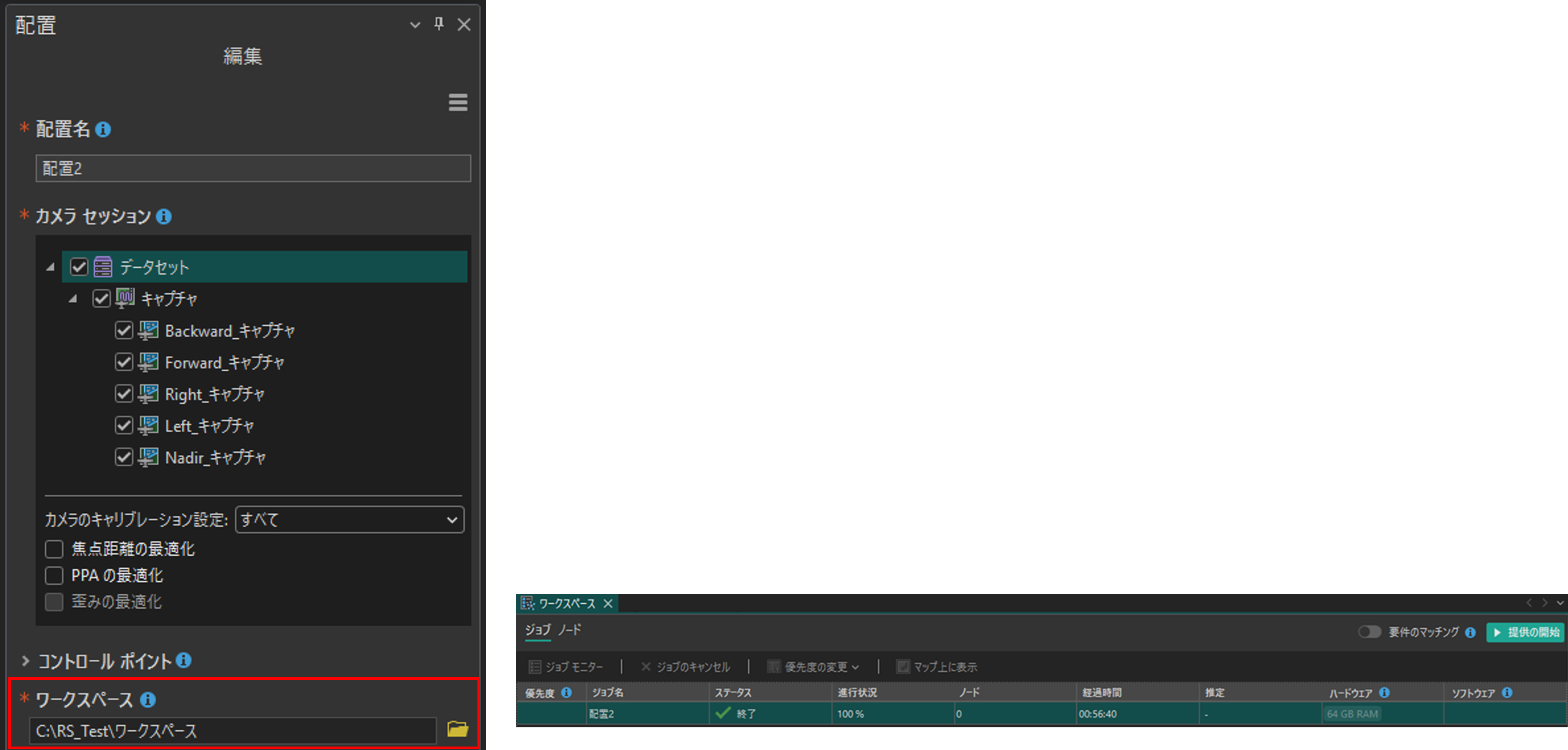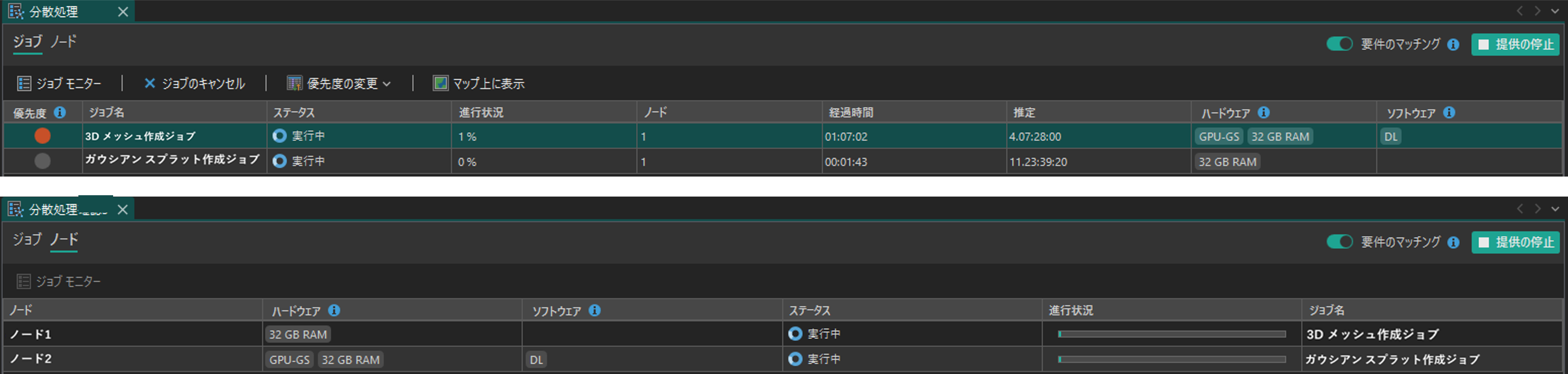 例:2 つのノードが参加しているワークスペースで、3D メッシュ作成ジョブとガウシアン スプラット作成ジョブを同時に実行。ガウシアン スプラットの作成には、ディープラーニング パッケージが必要ですが、ArcGIS Reality Studio はジョブ内容を判別し、要件を満たすノードを割り当てます。