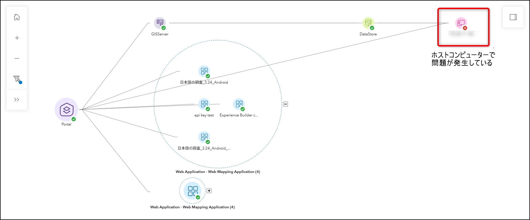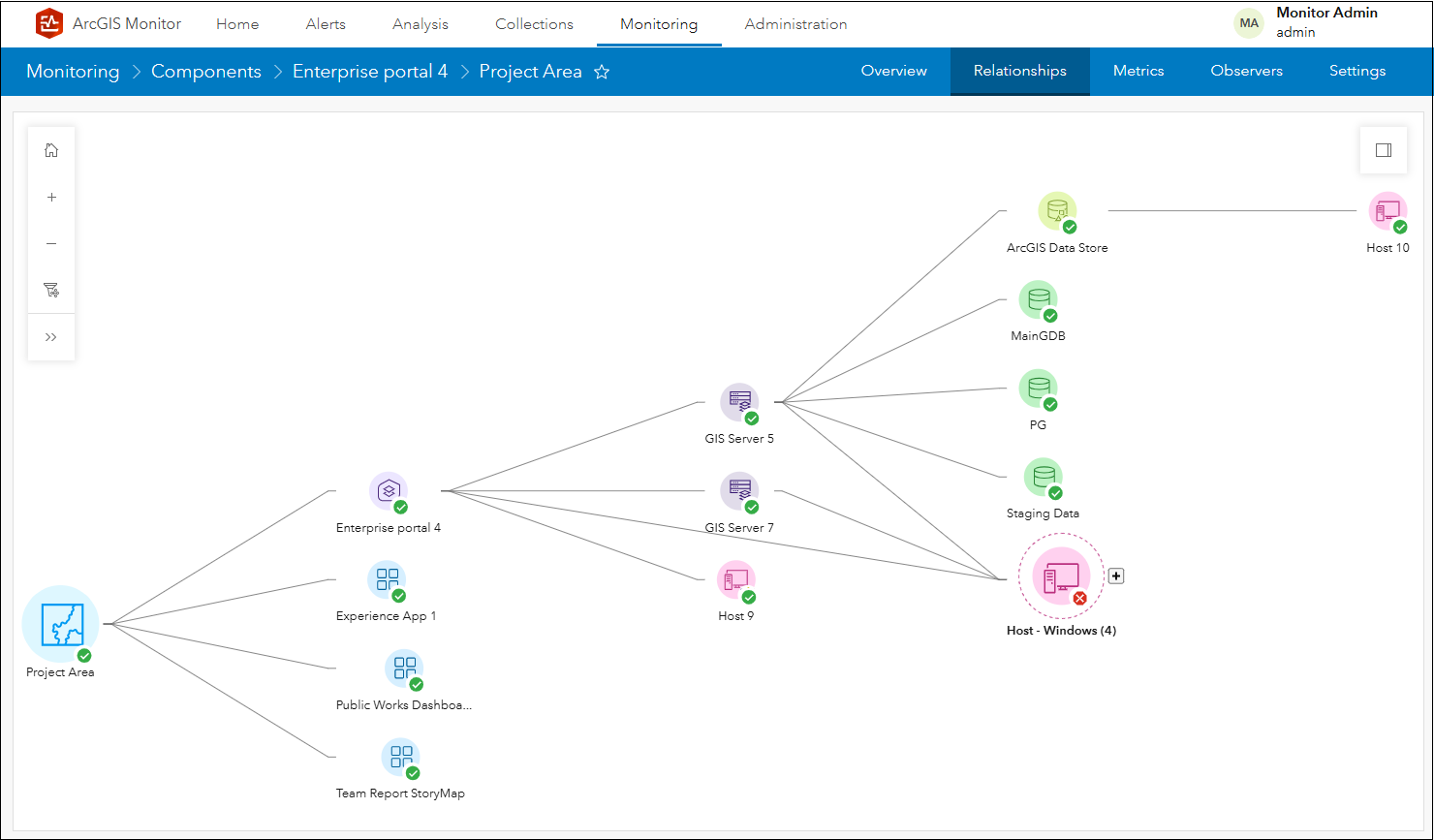 さらに、関係グラフを活用することで、警告や重大なステータスを持つシステム要素を迅速に特定し、問題解決までの時間を大幅に短縮できます。特に、複数の GIS Server やその他のコンポーネントを監視している場合、複雑な構成要素を視覚的に整理し、システム全体の構造を簡潔に理解することができます。