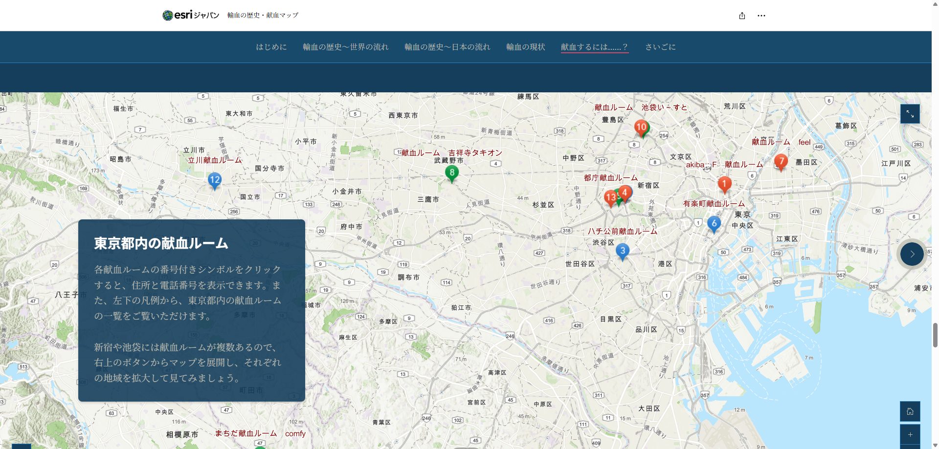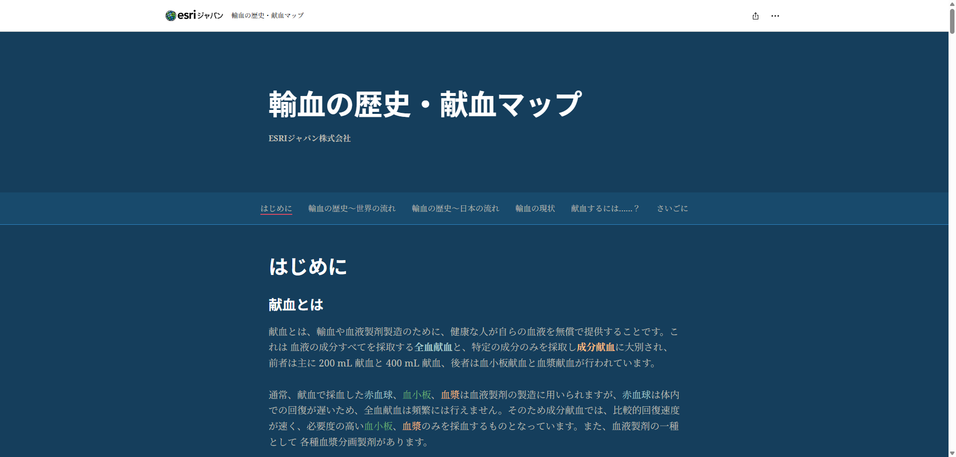 現在では、当たり前のように行われている輸血と献血ですが、その成立には世界的に長い歴史がありました。本日は ArcGIS StoryMaps を利用して作成したストーリー マップをご紹介します。世界献血者デーをきっかけに、輸血のなりたちと献血の歴史・現状についてマップを通じて学んでみませんか?   早速、「輸血の歴史・献血マップ」をご覧ください。 ※ 別ウィンドウで開いて見る方はこちら:「輸血の歴史・献血マップ」※公開は終了しました。