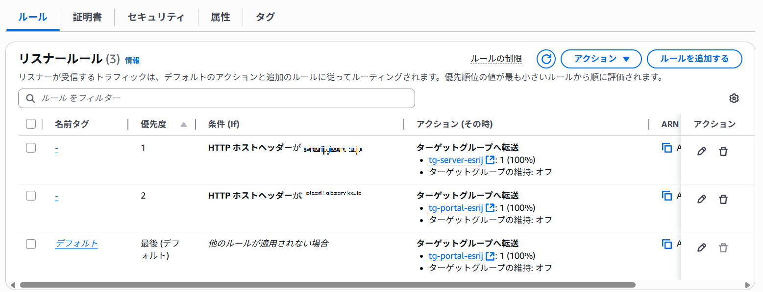 以下にあるのは ALB のリスナールールの画面ショットです。ArcGIS Server のホスト名 (例: svr.service.jp など) の場合は ArcGIS Server のターゲットグループに転送し、Portal for ArcGIS のホスト名 (例:pl.service.jp など) の場合は Portal for ArcGIS のターゲットグループに転送しています。