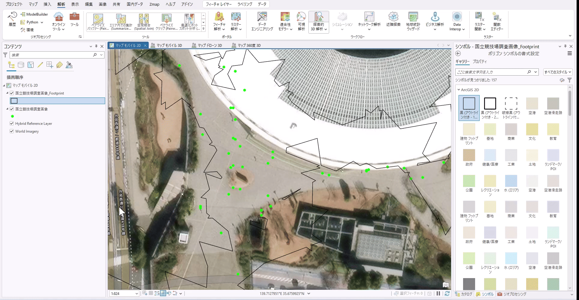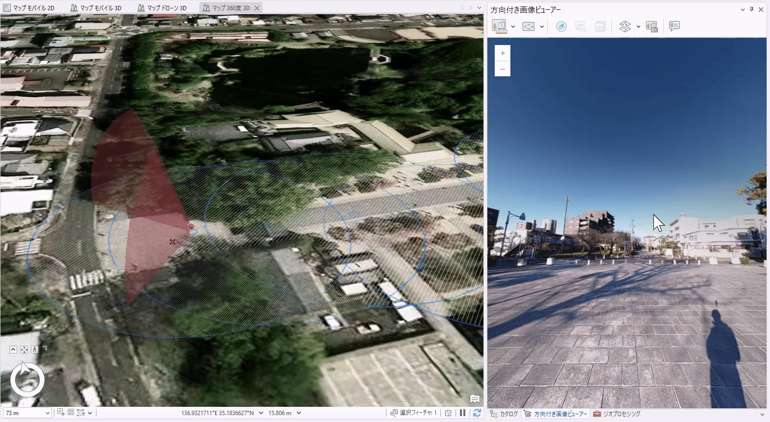 ArcGIS Pro では、スマートフォンで撮影した画像をもちろん、ドローンや車載カメラの画像なども読み込むことができます。また、水平固定の画像だけでなく、360 度の画像にも対応しています。
