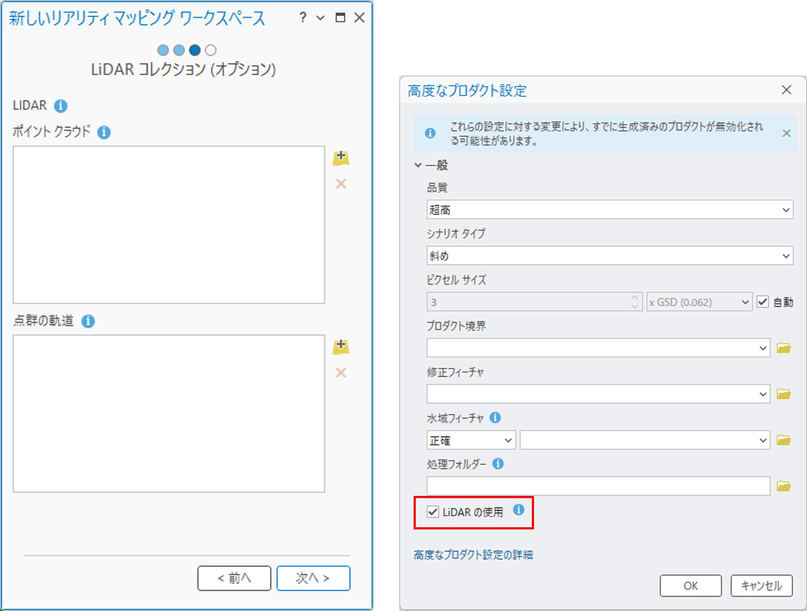 右図:プロダクトの設定作成時に、[LiDAR の使用] を有効化して、LiDAR を統合した生成を実行。