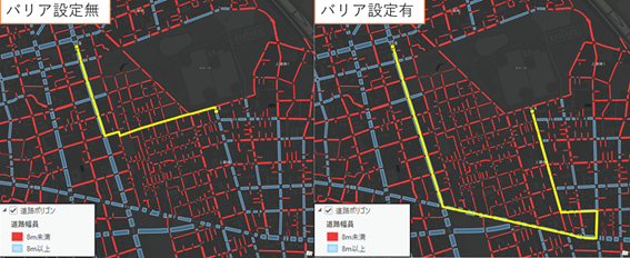大型車は、道路幅員が狭い道路を通ることができないため、幅員を考慮したルート選択が必要です。ArcGIS では、バリアを利用することで、道路幅員を条件にしたルート解析が可能です。