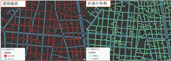 このように、道路境界のデータをポリゴン化し、幅員や歩道の情報を付与することで、
