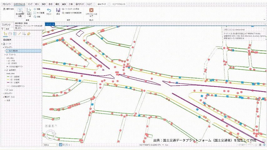 本データは、位置の基準となる道路境界およびマンホールの 3 次元座標を位置情報レベル 500 相当の位置精度で整備しています(原典データは GSD5cm の高解像度航空写真トゥルーオルソ画像、数値表層モデル(DSM)、MMS 計測データを利用)。そのため、BIM データを ArcGIS 上に取り込んだ際の高精度な位置合わせに活用できます。実際に、ArcGIS のジオリファレンス機能を利用して、BIM データを位置合わせしてみました。