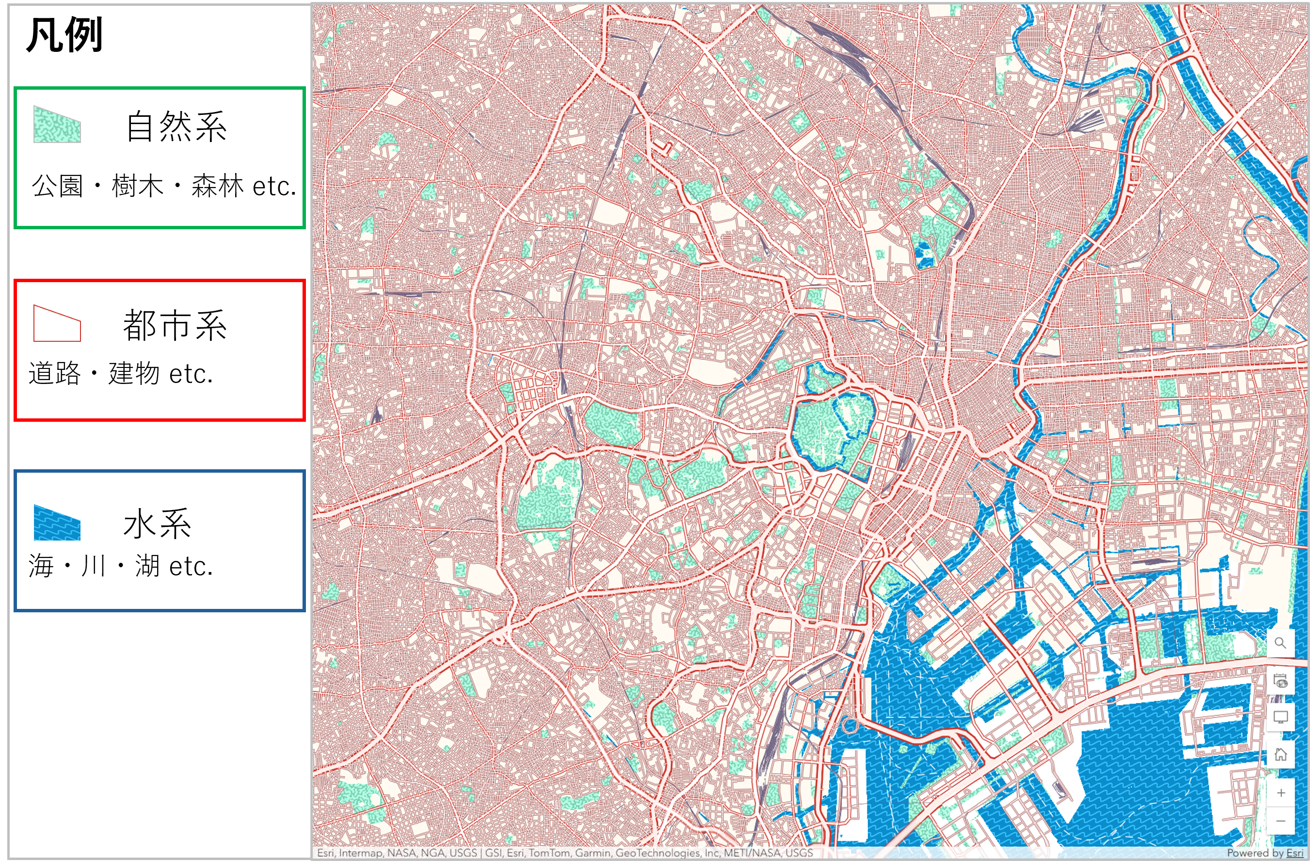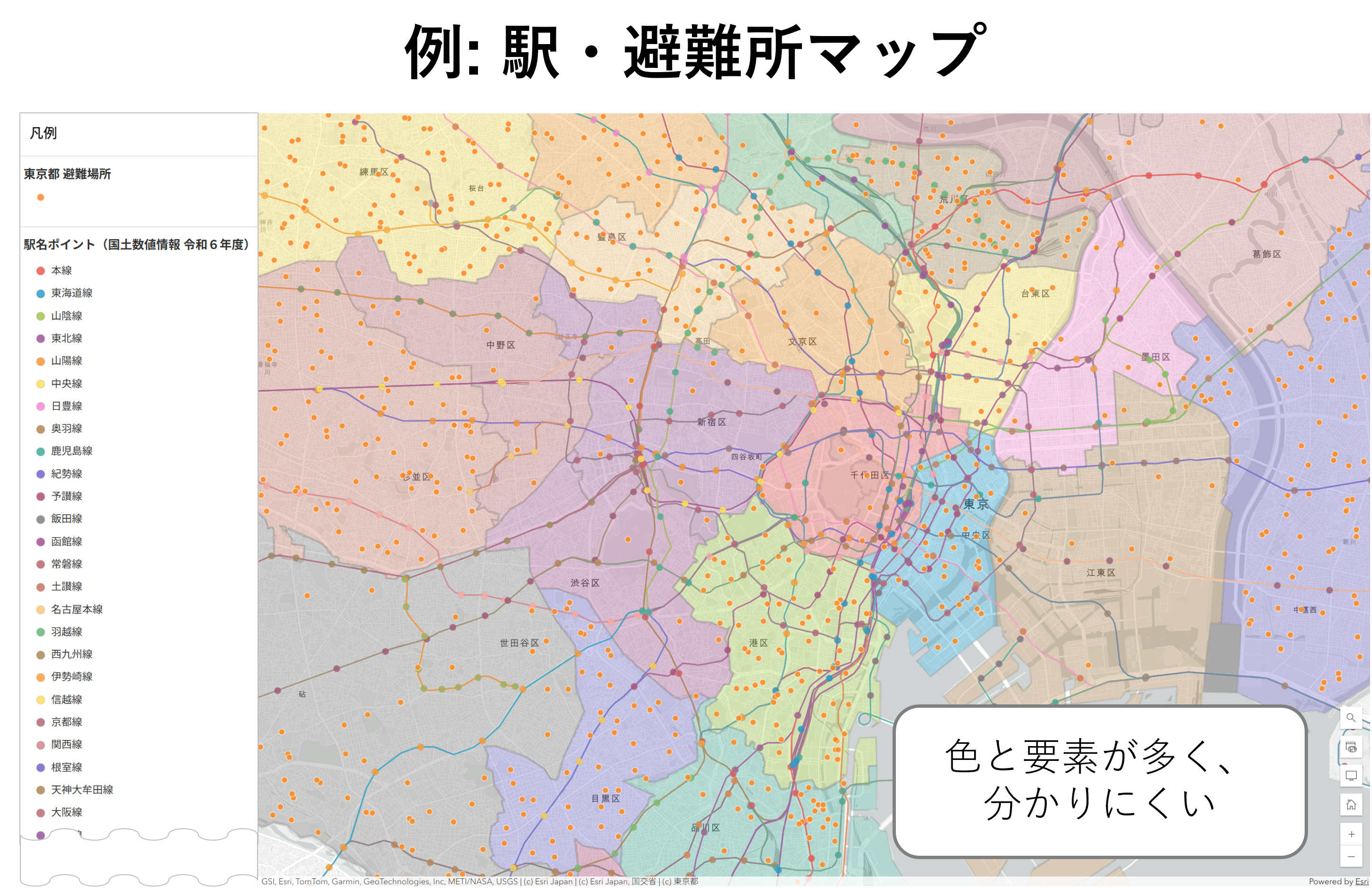色選びはマップの見やすさを決める重要な要素です。情報量の多いマップであっても、適切な色選びを行うことで情報を整理でき、たとえ凡例を見なくても直感的に理解できるマップを作ることができます。