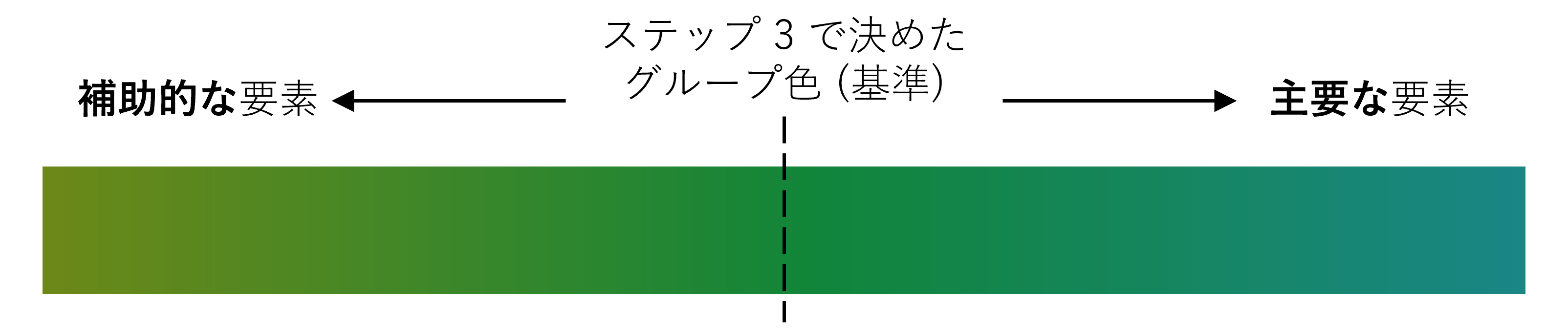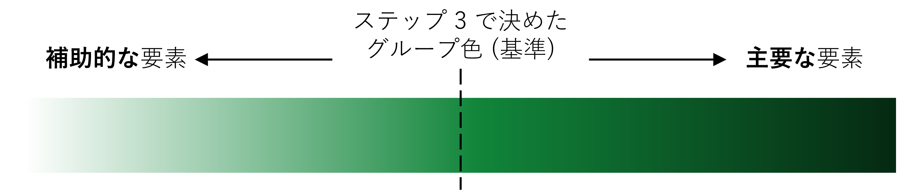 同じグループ内でも、要素ごとに重要度や役割は異なります。その違いを視覚的に伝えるためには、濃淡 (明度) や彩度を調整し、主要な要素は濃色、補助的な要素は淡色で表現すると効果的です。