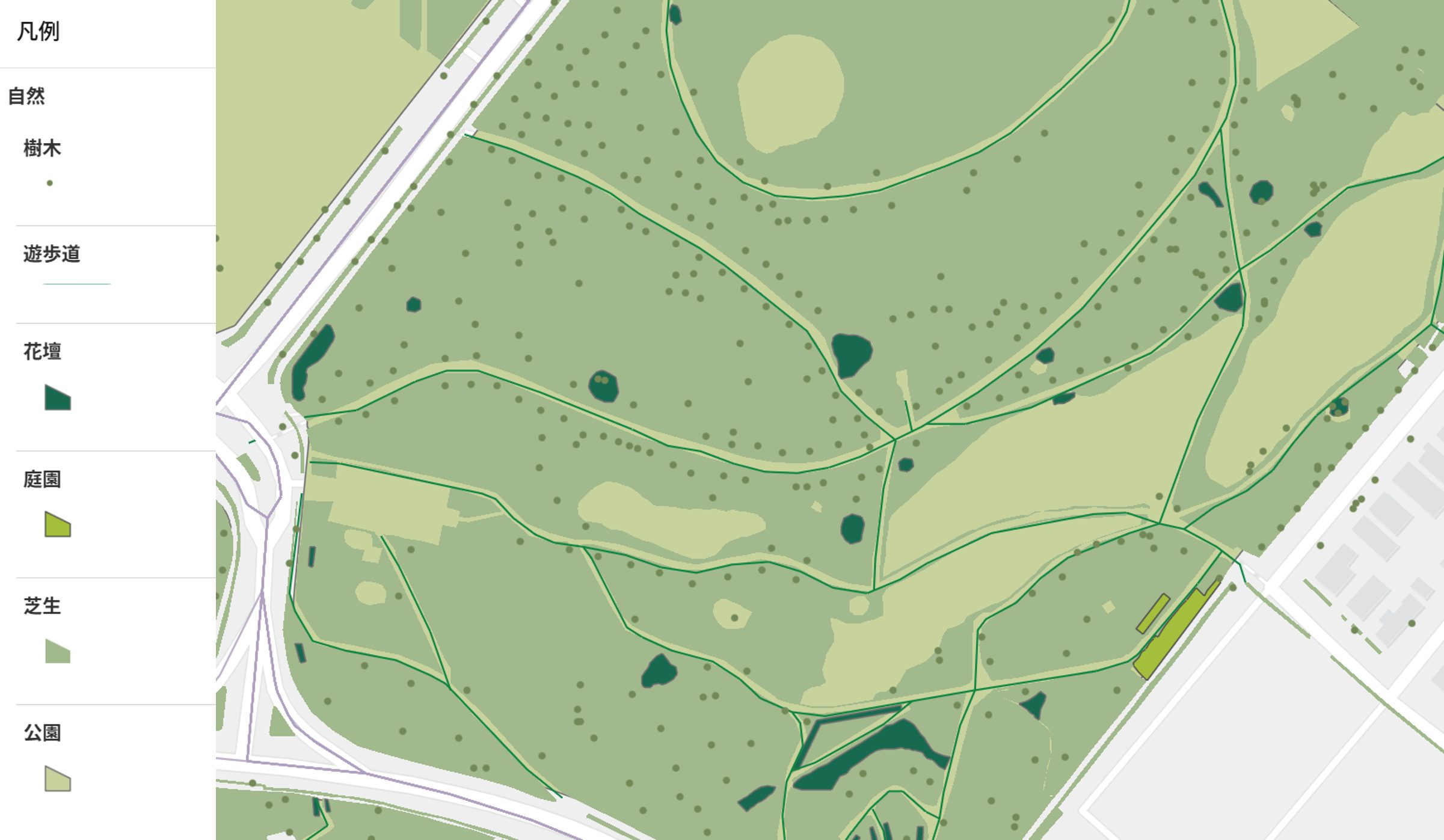 公園案内マップの自然グループに目を向けると、公園の範囲を示す「公園」レイヤーを最も淡い色とし、よく利用される「遊歩道」や「花壇」は濃い色で強調しました。このように、色の濃淡と微妙な色相差を組み合わせることで、同じグループ内での統一感を維持しながら情報の階層を自然に表現できます。