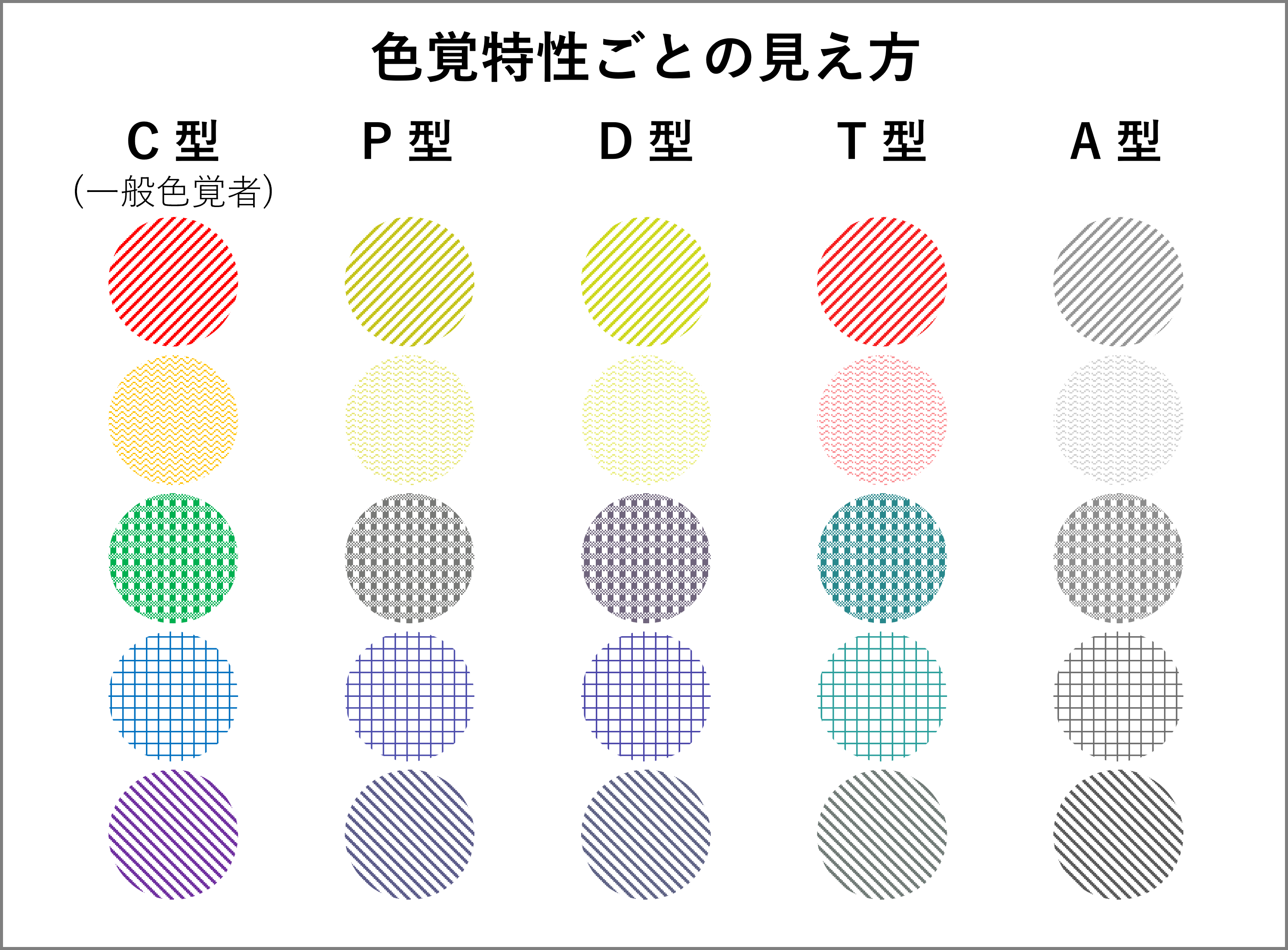 そのため、シンボルの形やサイズを変えることで、同系色であっても簡単に識別できるようにすることが重要です。さらに、パターンやアウトラインを併用することで、色覚に依存しない表現を実現できます。
