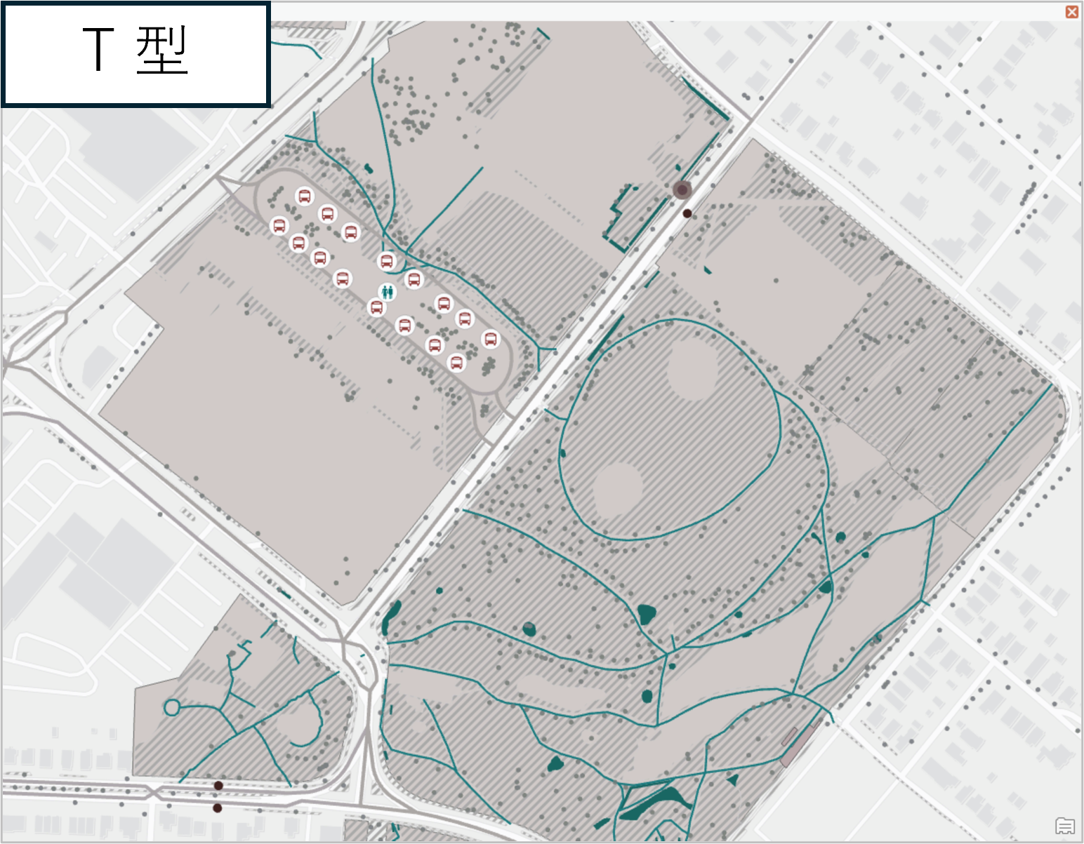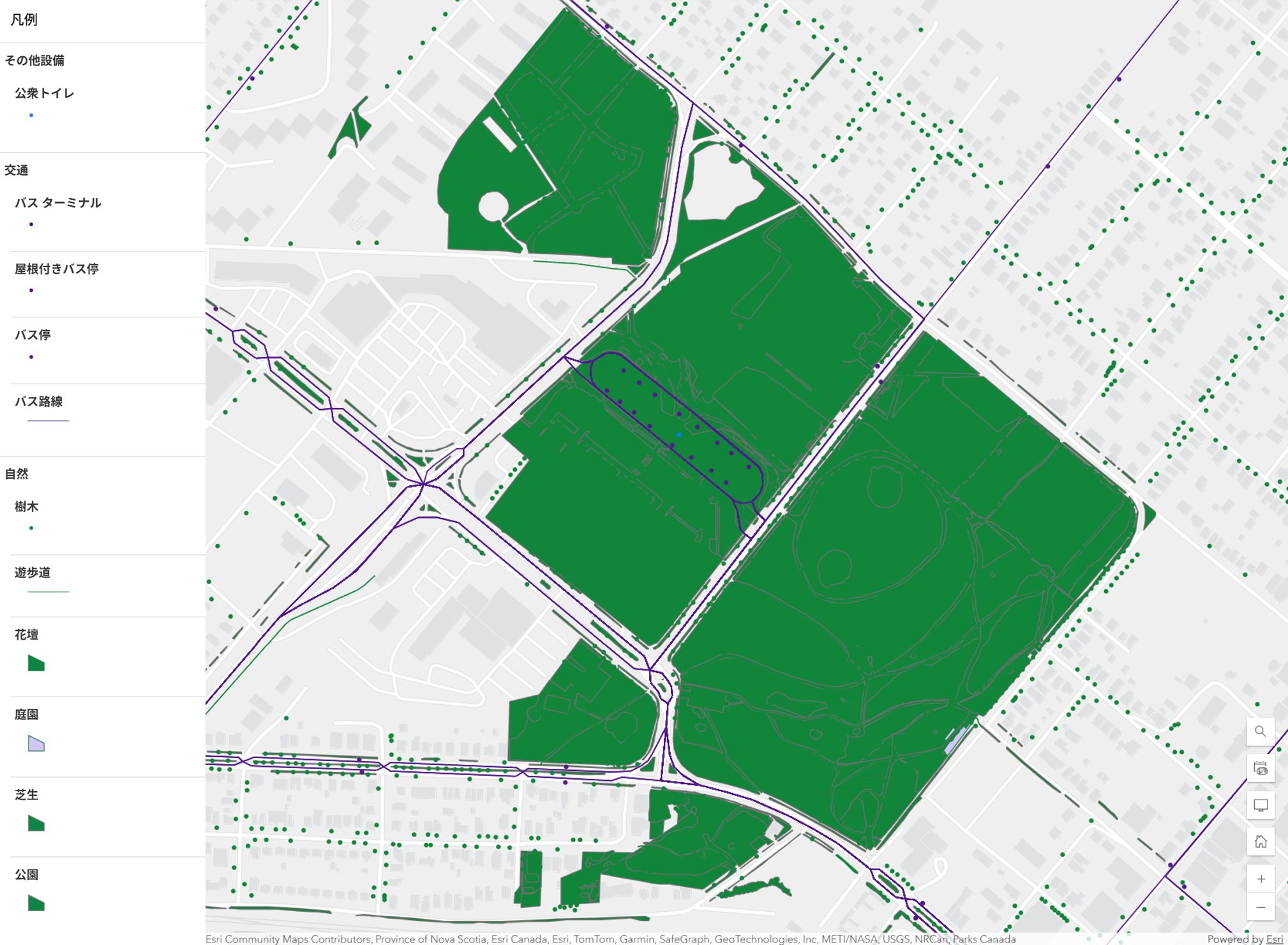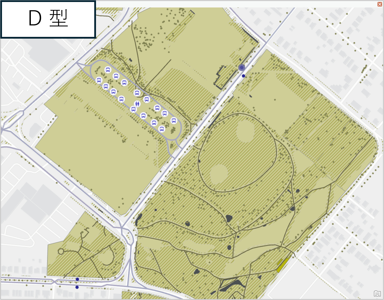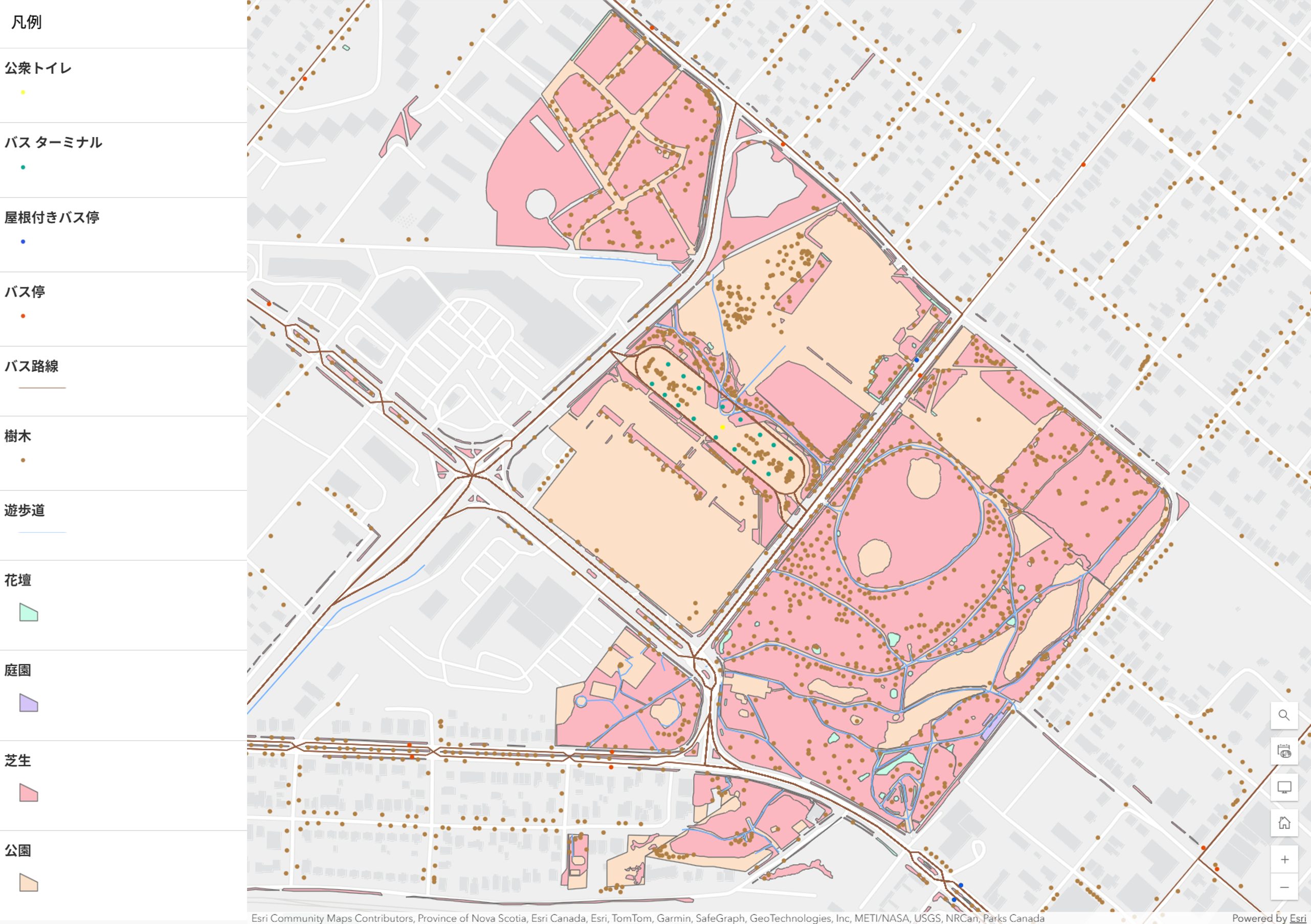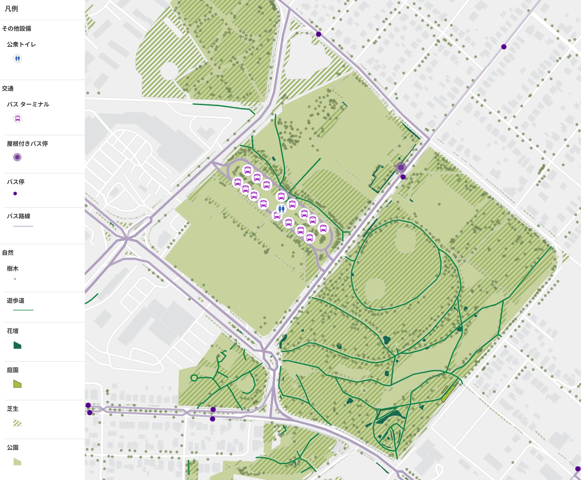 今回の公園案内マップでは図のようにシンボルを設定しました。芝生にパターンを設定したほか、バス ターミナルやトイレについてはシンボルを変更しました。また、屋根付きバス停を通常のバス停と区別するため、幅広のアウトラインを付けています。