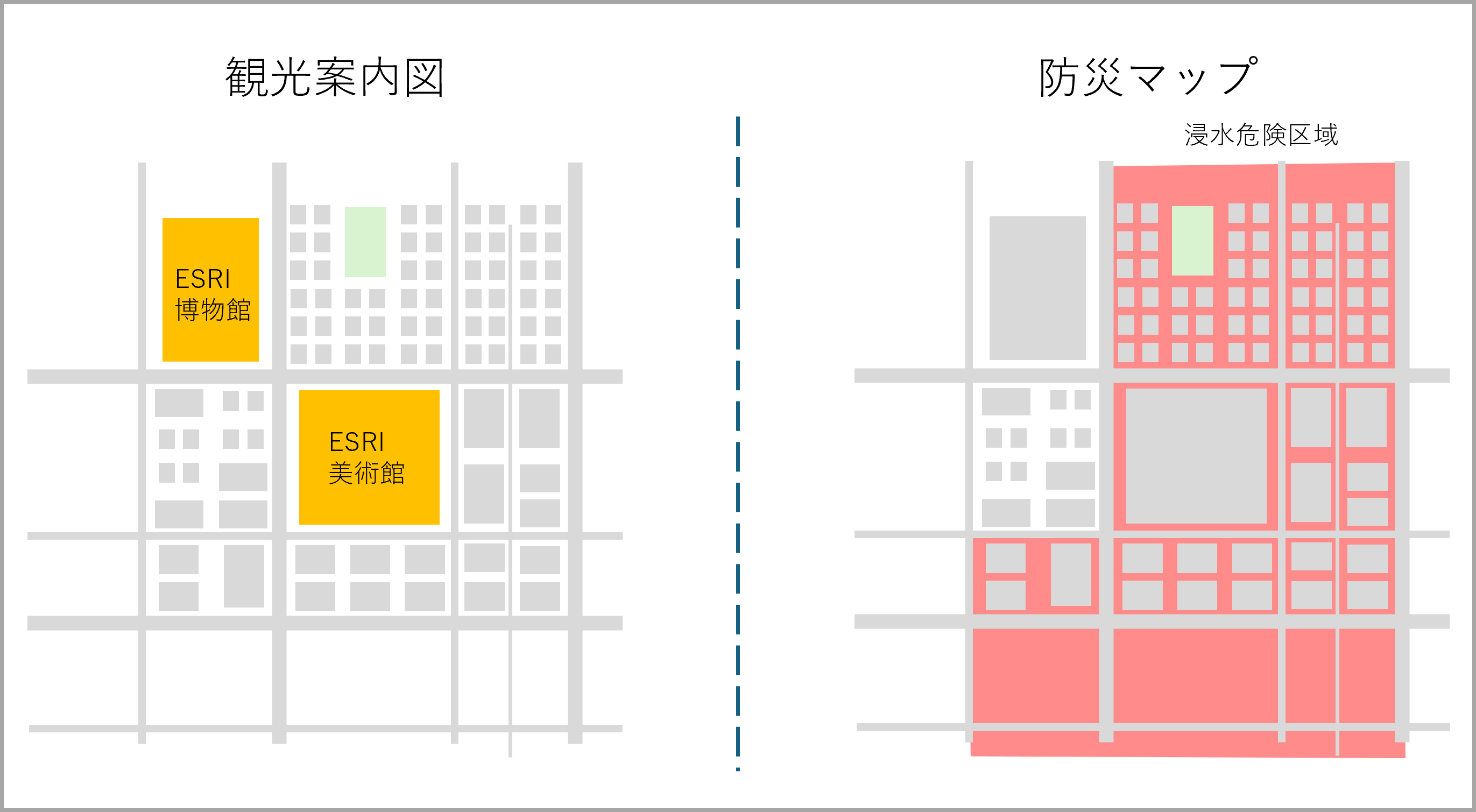 また、この際に重要なのは、文脈に応じて「似ている/違う」を判断することです。たとえば、建物というカテゴリーを考えてみましょう。観光案内図では、博物館や美術館などの文化施設は住宅やオフィスと区別して強調することが自然ですが、防災マップでは、避難所や危険区域などの情報を強調するために、建物はすべて同じ色で表現するのが適切です。