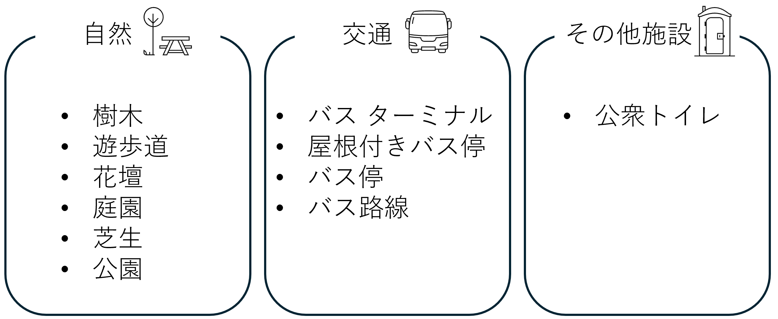 さて、今回の交通案内マップでは、図のように自然、交通、その他設備という 3 つのグループに分けることにしました。