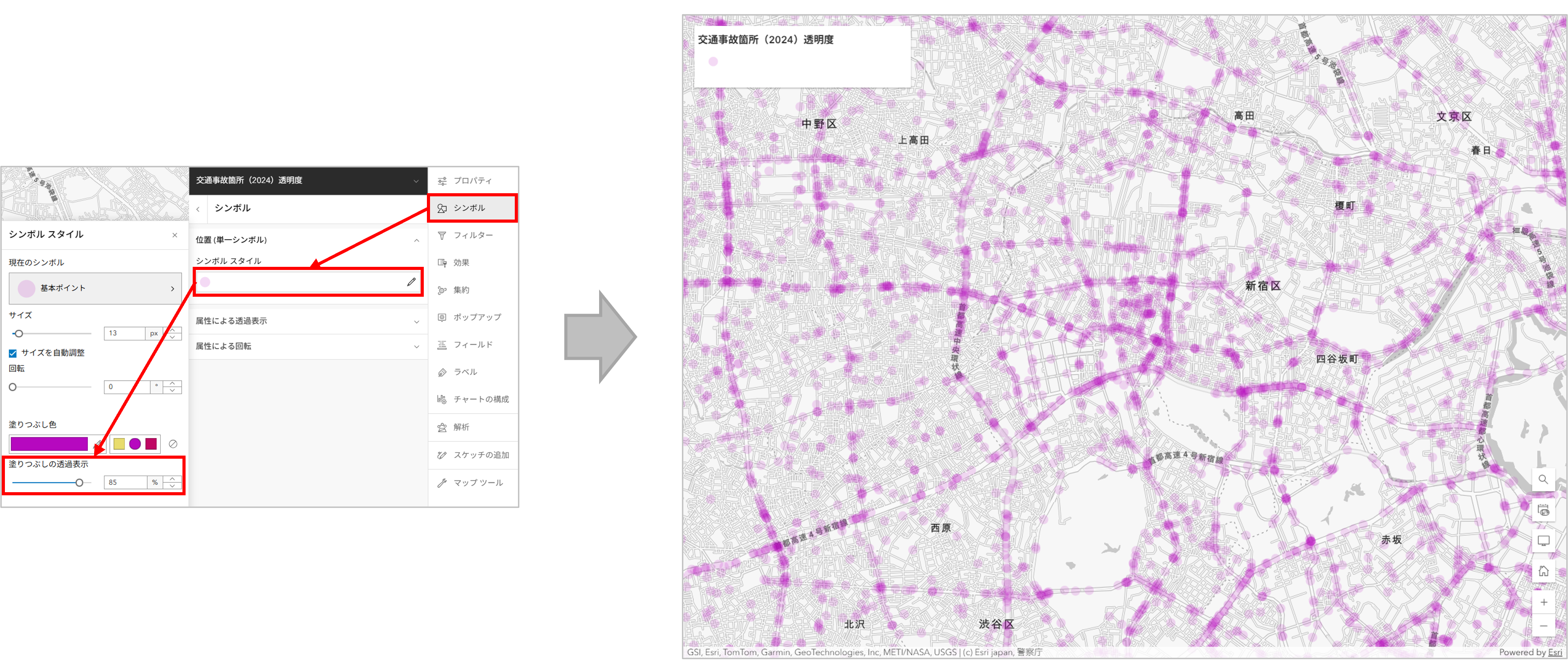 ArcGIS Online には、シンボル スタイルや透明度、効果など、データを見やすく表現するためのさまざまなオプションが用意されています。これらを使用することで、ポイント密度をよりわかりやすく表現できます。