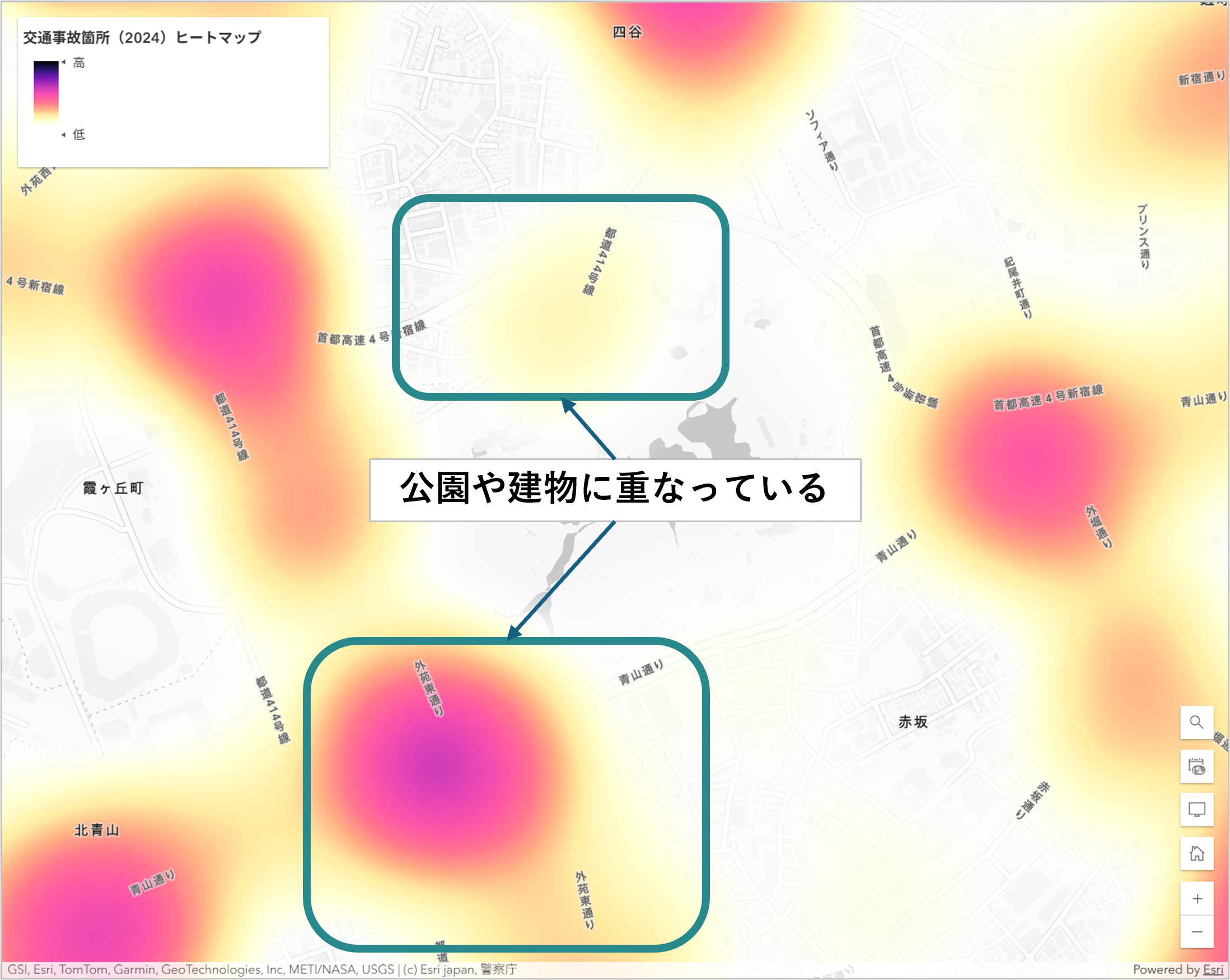 また、ヒート マップではポイント間の値を補完するため、本来データがないエリア (今回は交通事故が発生しない公園や建物の上など) にも色がかかる場合があります。半径や強度を適切に調整することが重要です。