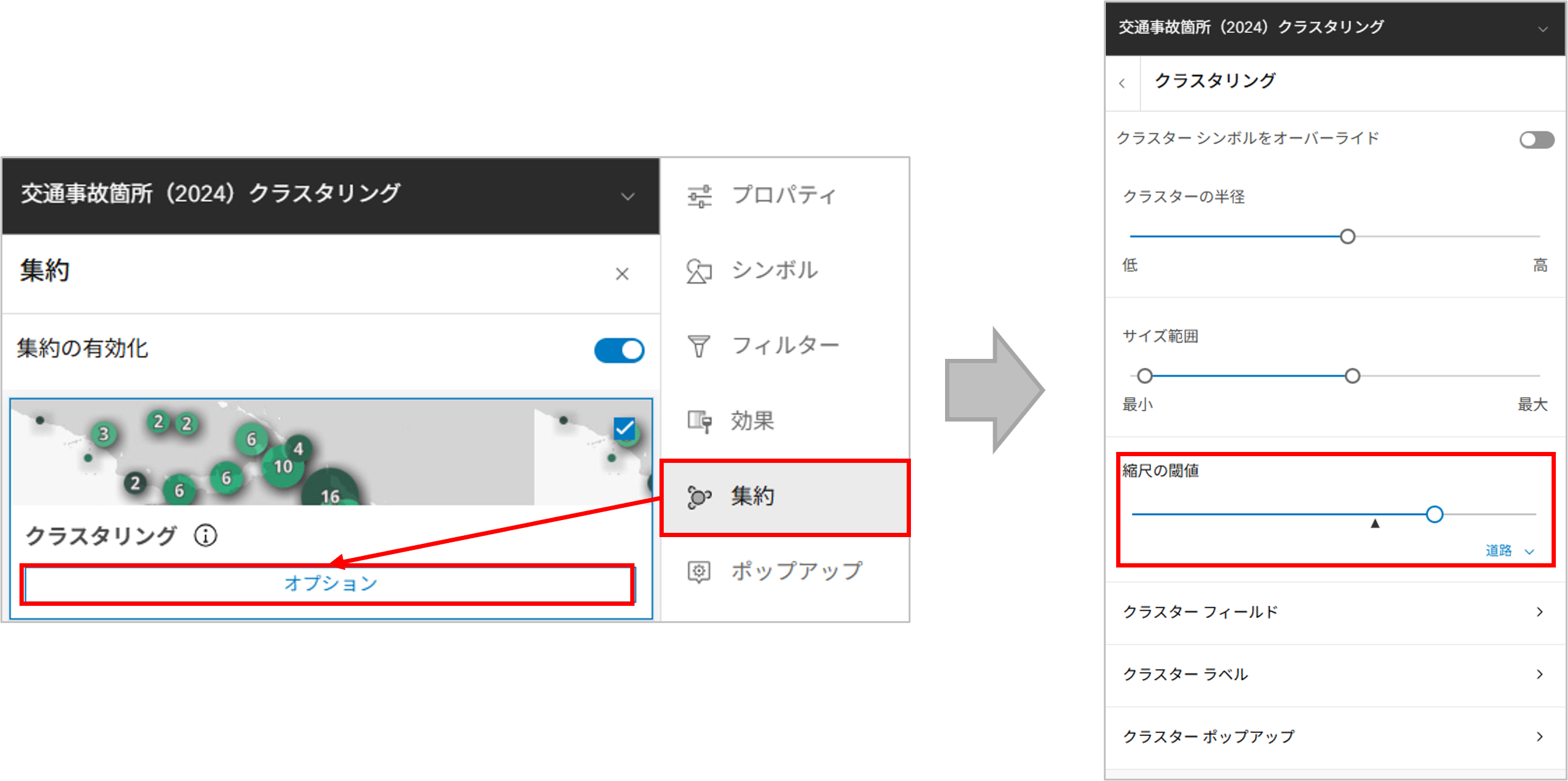 クラスタリングでは表示縮尺の閾値を設定することも可能で、小縮尺の場合はクラスタリングを表示し、拡大した場合には個別のポイントを表示するなど、表示縮尺に応じた対話的なクラスターが利用できます。