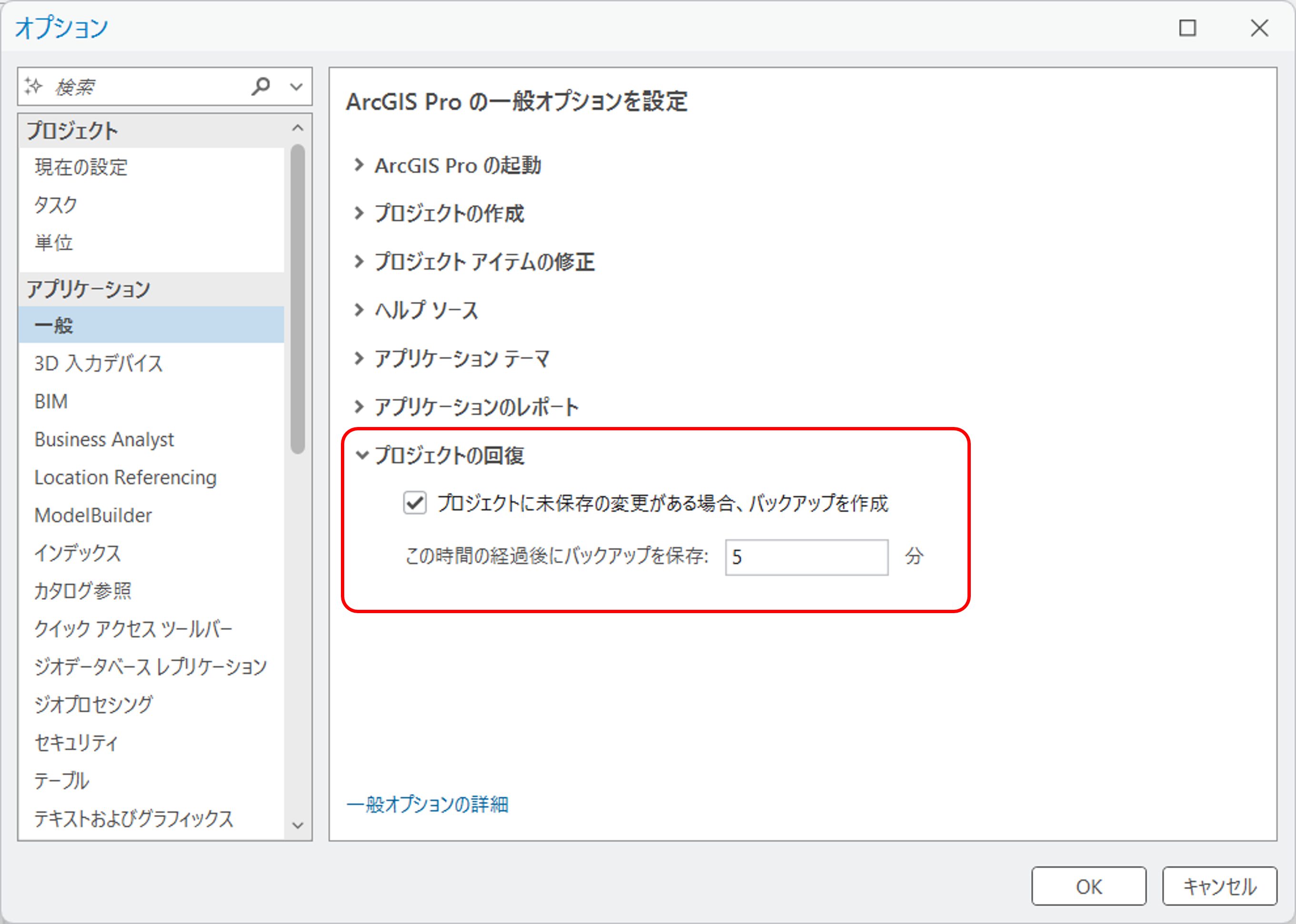 プロジェクト回復のデフォルトの変更は、ArcGIS Pro の起動 → [設定] → [オプション] → [一般] タブ → [プロジェクトの回復] から可能です。