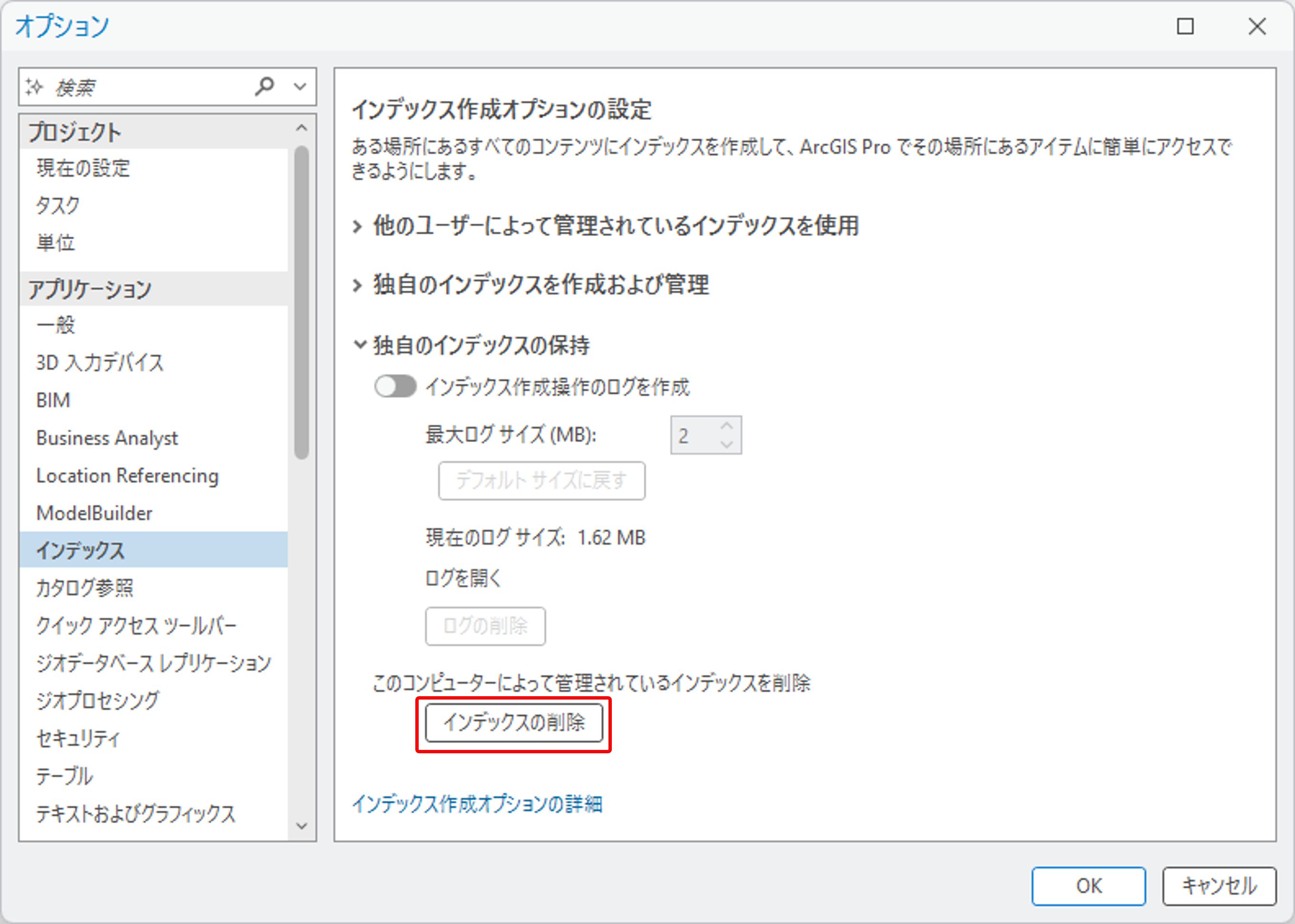 インデックスの削除は、[オプション] → [インデックス] タブ→ [インデックスの削除] から可能です。[インデックスの削除] ボタンをクリックするとすぐに削除が行われ、元に戻すことはできませんのでご注意ください。